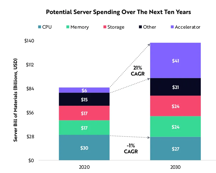 尽管竞争激烈,但ARK认为,由于其无与伦比的可编程性和软件堆栈,GPU将在未来五年继续主导加速器市场。