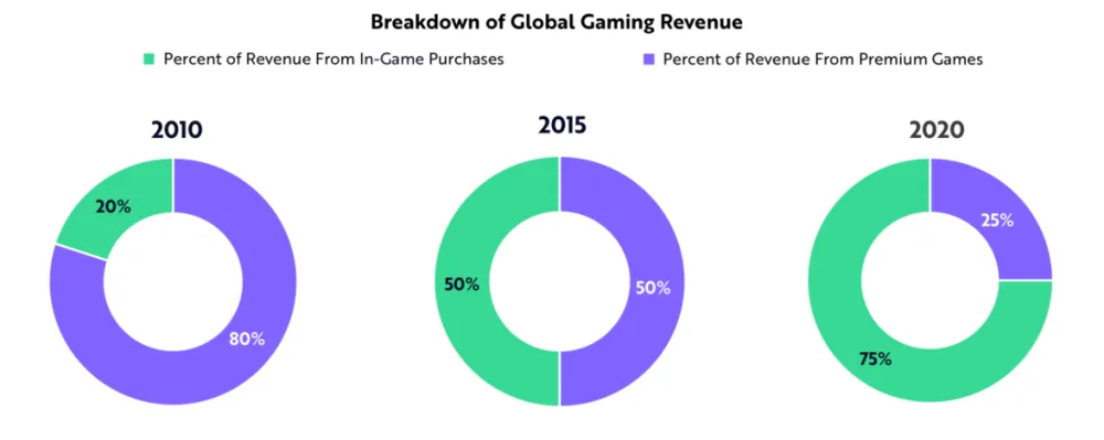 伴随着视频游戏的发展,其商业模式也在不断发展之中。根据我们的研究,在过去10年里,游戏中的内购在游戏总收入中的占比从 20% 大幅增加到了 75%。到2025年,可能进一步增至95%。