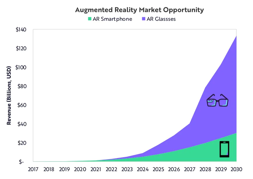 ARK预计,到2030年前,AR的市场规模可以从今天的不足10亿美元增长至1300亿美元。