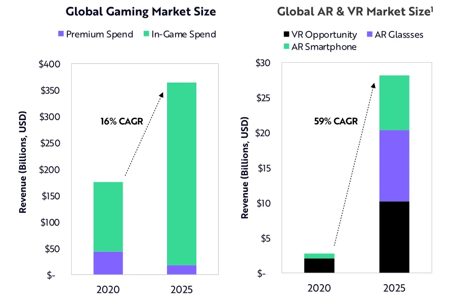 根据我们的研究,未来5年,全球游戏市场将会以每年16%的复合增长率扩增,规模从2020年的1750亿美元增至2025年的3650亿美元。