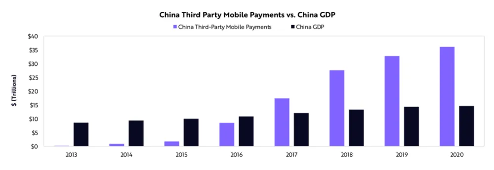 在短短5年内,中国的移动支付规模爆炸式增长了15倍以上,从2015年的大约2万亿美元,增加到今天的36万亿美元左右,接近于2020年中国GDP总量的三倍。