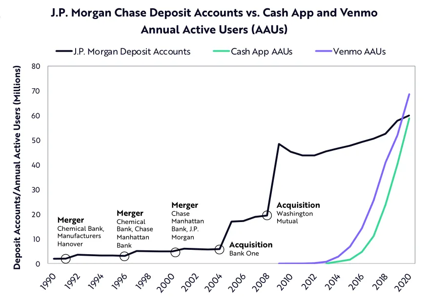到2020年底,摩根大通存款帐户持有人总数约为6000万,而Cash App和Venmo的年度活跃用户(AAU)分别达到5900万和6900万。