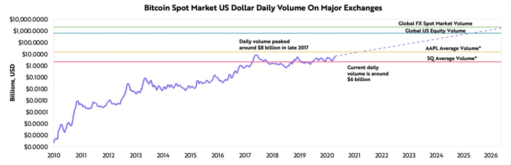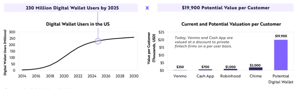 根据ARK的研究,如今,每位用户的数字钱包价值在250美元到1900美元之间,有可能扩增到2万美元,这意味着到2025年,美国将有4.6万亿美元的市场机会。