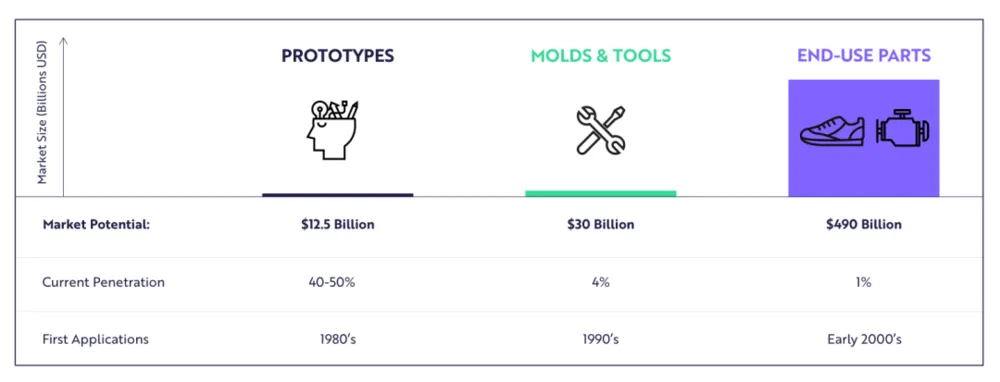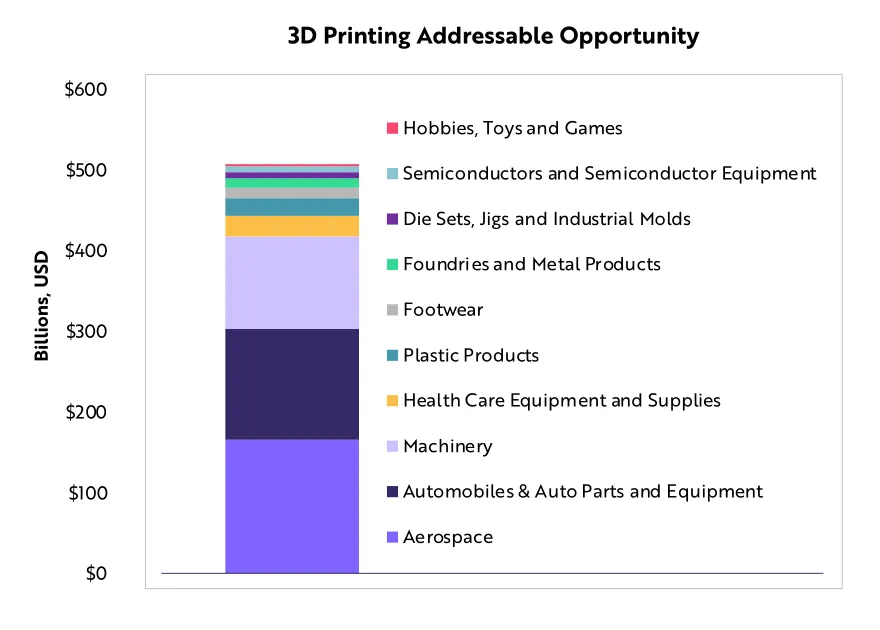 ARK认为,未来3年,全球3D打印市场将以60%的复合年增长率扩张,将从如今的120亿美元增长到2025年的1200亿美元左右。