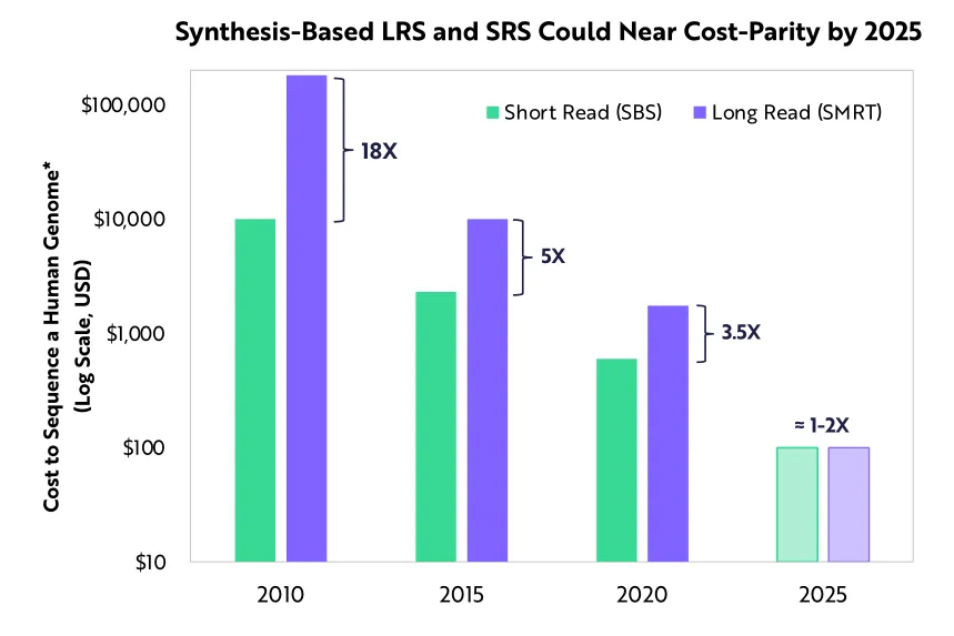 ARK认为,与短读测序相比,长读测序技术可以提供更高的准确性、更全面的变体检测以及更丰富的功能集。到2025年底,高精准度的长读测序和短读测序的成本将相近。