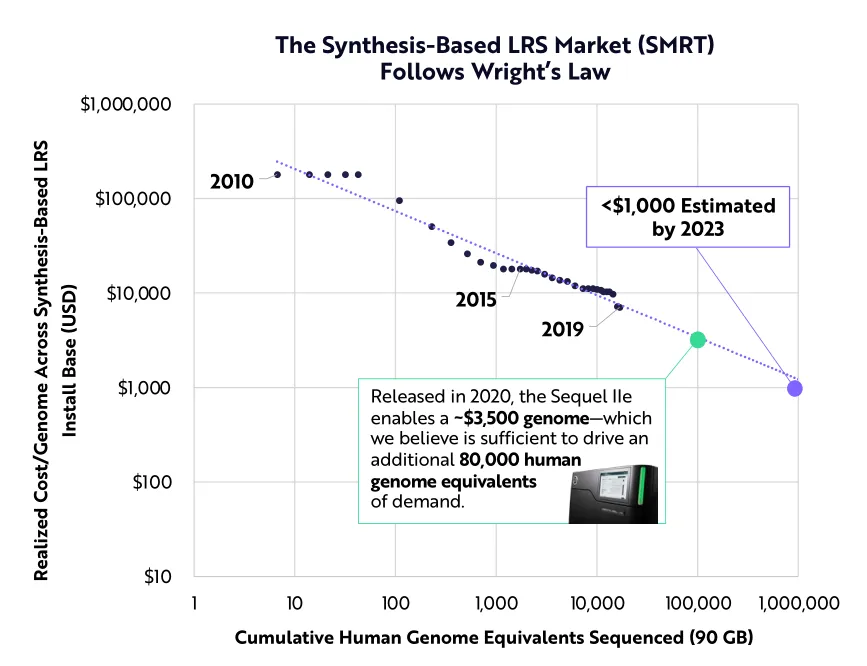 ARK认为,由于较低的测序成本以及对高精度和完整结果的需求,市场对长读测序的需求正触及拐点。