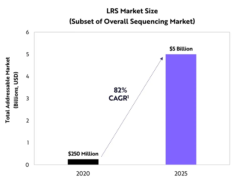 我们预计,长读测序市场规模将以每年82%的复合年增长率扩张,从2020年的2.5亿美元增长到2025年的50亿美元左右。