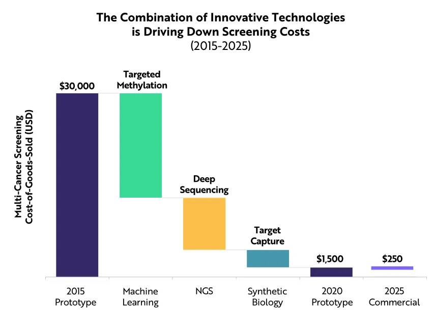 综合运用创新技术将多种癌症筛查的费用从2015年的3万美元降到了现在的1500美元,降低了20倍,根据ARK的研究,2025年的费用将再降低80%,达到250美元。