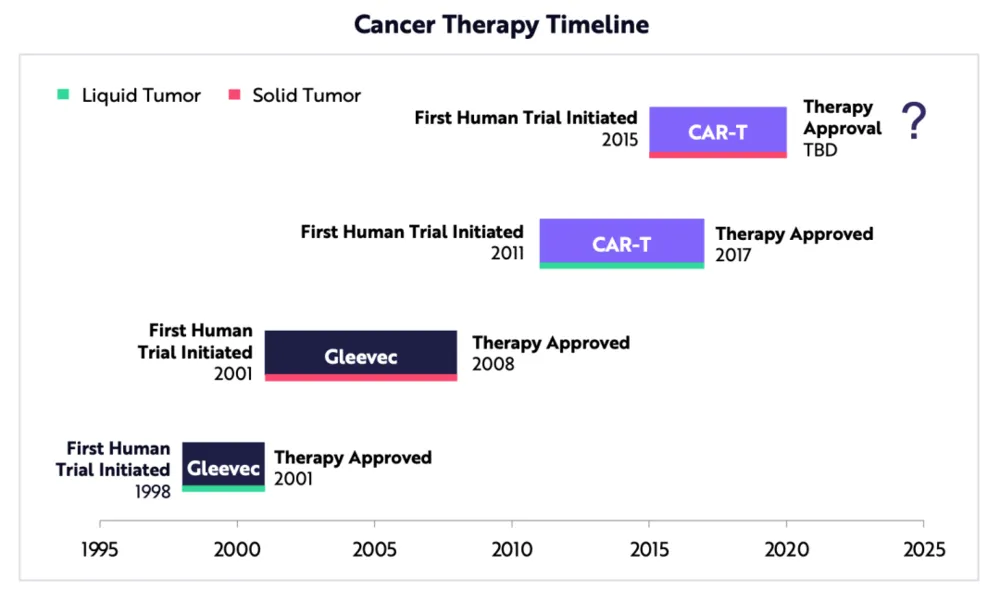 美国食品和药物管理局(FDA)经过10年试验后批准了口服化疗药格列卫Gleevec,其中7年用于实体肿瘤。这表明,FDA可能会在2025年批准首个用于实体肿瘤的CAR-T疗法。