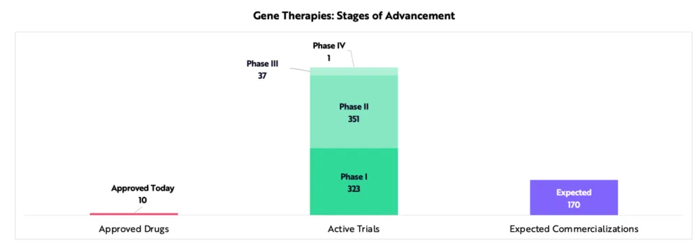 到目前为止,FDA只批准了10种基因疗法。截至2020年底,712项活性基因治疗临床试验正在进行中,其中238项于2020年启动。根据典型的试验失败率估算,大约有170种基因疗法可能会在未来十年内获得批准并商业化。