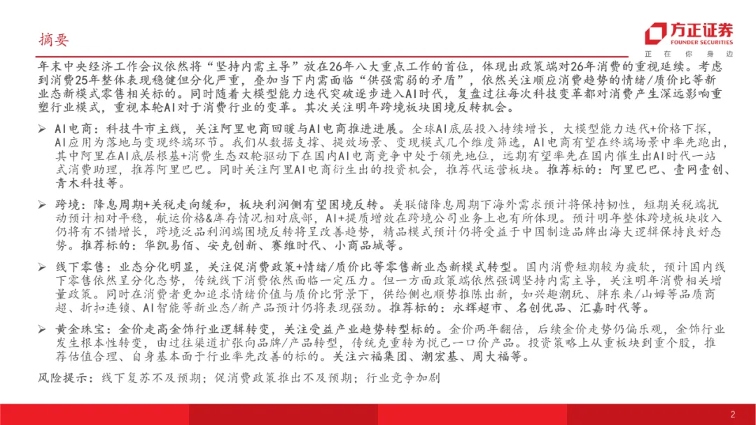 本文来自方正证券研究所于2025年12月26日发布的报告《2026商贸零售行业年度策略:线上掘金AI电商产业机遇,线下业态分化看变革》,欲了解具体内容,请阅读报告原文。