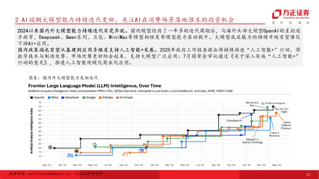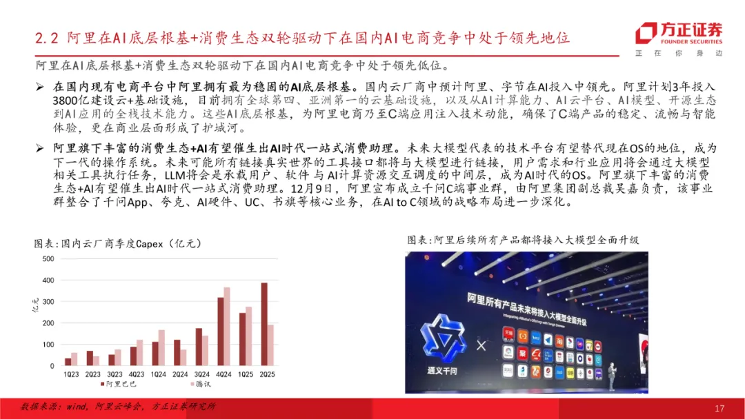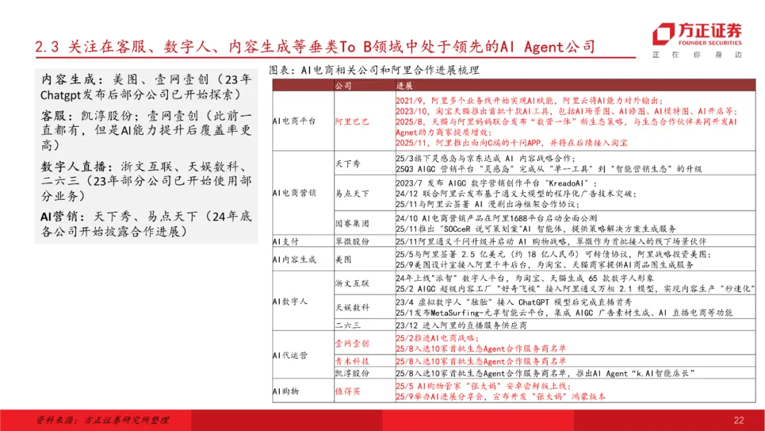 AI电商:科技牛市主线,关注阿里电商回暖与AI电商推进进展。全球AI底层投入持续增长,大模型能力迭代+价格下探,AI应用为落地与变现终端环节。我们从数据支撑、提效场景、变现模式几个维度筛选,AI电商有望在终端场景中率先跑出,其中阿里在AI底层根基+消费生态双轮驱动下在国内AI电商竞争中处于领先地位,远期有望率先在国内催生出AI时代一站式消费助理,推荐阿里巴巴。同时关注阿里AI电商衍生出的投资机会,推荐代运营板块。推荐标的:阿里巴巴、壹网壹创、青木科技等。