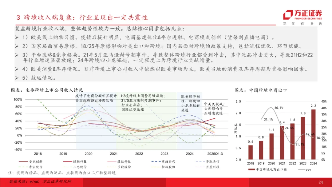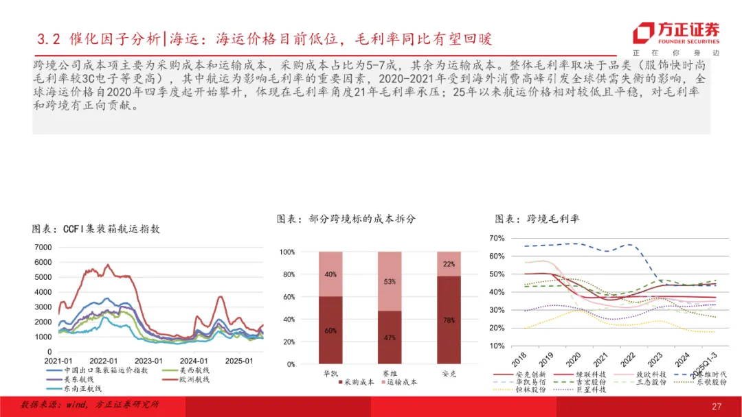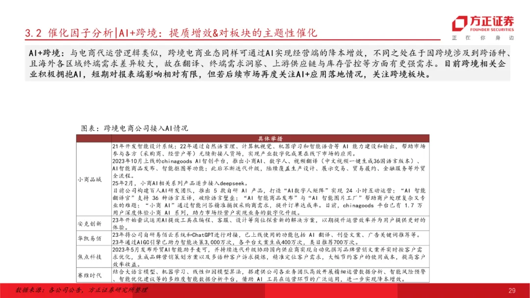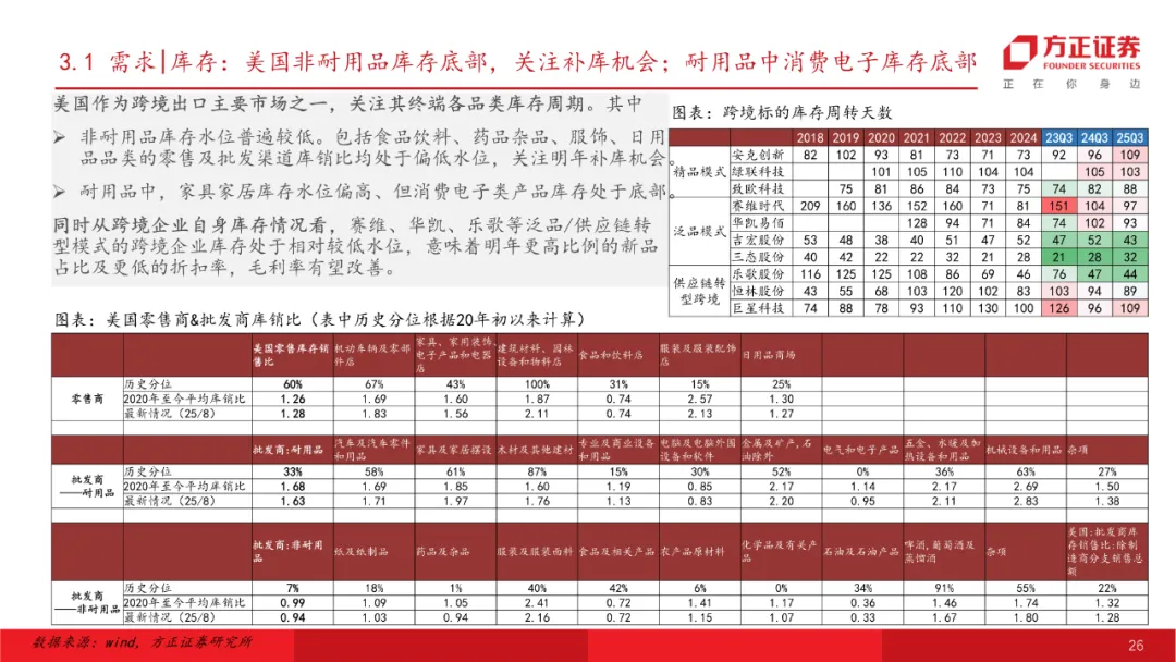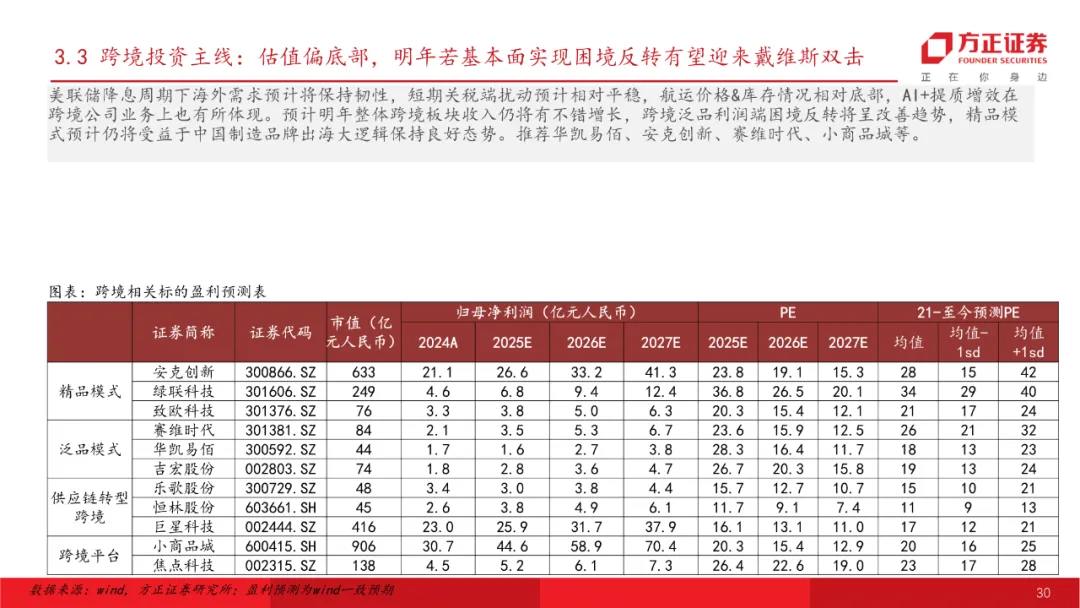 跨境:降息周期+关税走向缓和,板块利润侧有望困境反转。美联储降息周期下海外需求预计将保持韧性,短期关税端扰动预计相对平稳,航运价格&库存情况相对底部,AI+提质增效在跨境公司业务上也有所体现。预计明年整体跨境板块收入仍将有不错增长,跨境泛品利润端困境反转将呈改善趋势,精品模式预计仍将受益于中国制造品牌出海大逻辑保持良好态势。推荐标的:华凯易佰、安克创新、赛维时代、小商品城等。