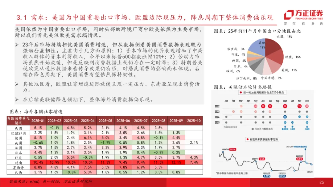 年末中央经济工作会议依然将“坚持内需主导”放在26年八大重点工作的首位,体现出政策端对26年消费的重视延续。考虑到消费25年整体表现稳健但分化严重,叠加当下内需面临“供强需弱的矛盾”,依然关注顺应消费趋势的情绪/质价比等新业态新模式零售相关标的。同时随着大模型能力迭代突破逐步进入AI时代,复盘过往每次科技变革都对消费产生深远影响重塑行业模式,重视本轮AI对于消费行业的变革。其次关注明年跨境板块困境反转机会。