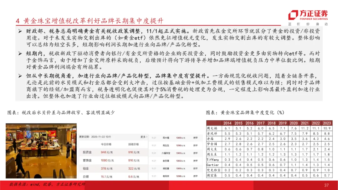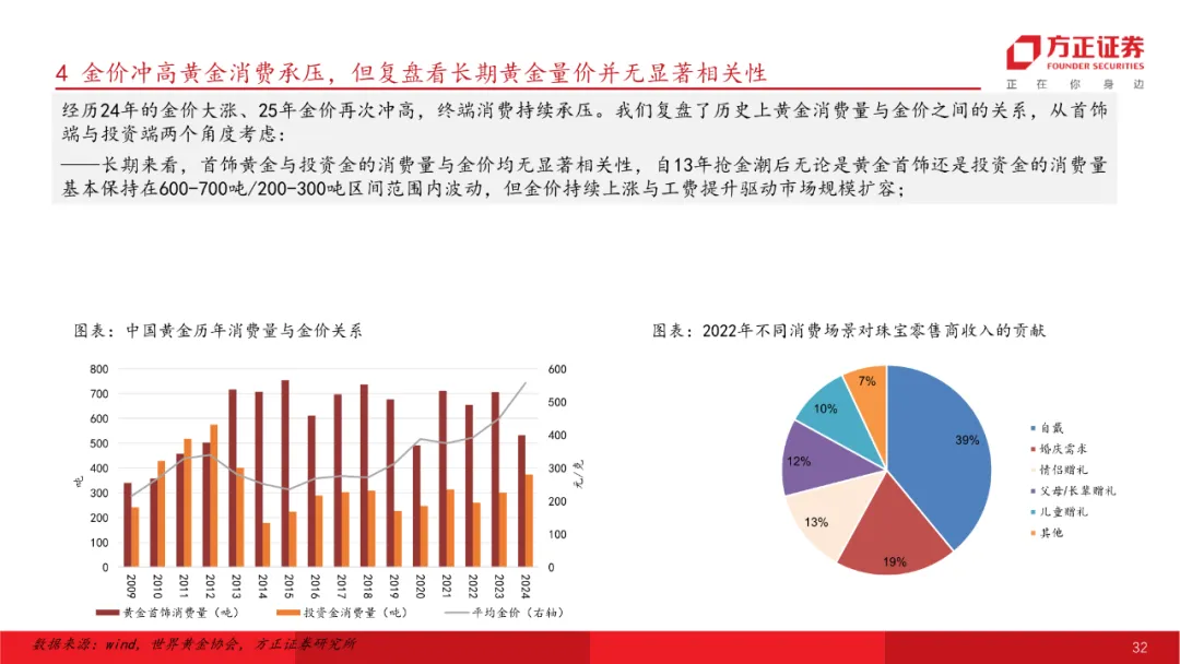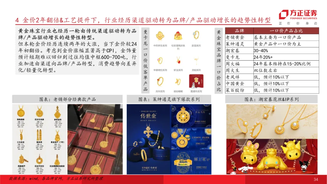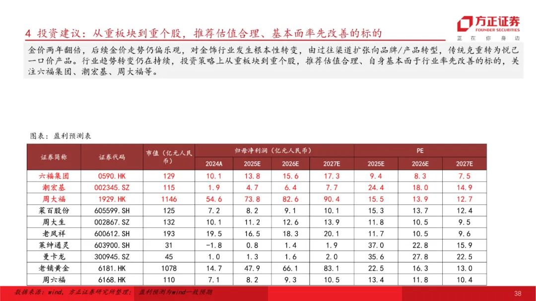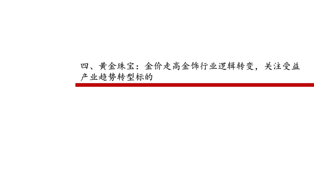 黄金珠宝:金价走高金饰行业逻辑转变,关注受益产业趋势转型标的。金价两年翻倍,后续金价走势仍偏乐观,金饰行业发生根本性转变,由过往渠道扩张向品牌/产品转型,传统克重转为悦己一口价产品。投资策略上从重板块到重个股,推荐估值合理、自身基本面于行业率先改善的标的。关注六福集团、潮宏基、周大福等。