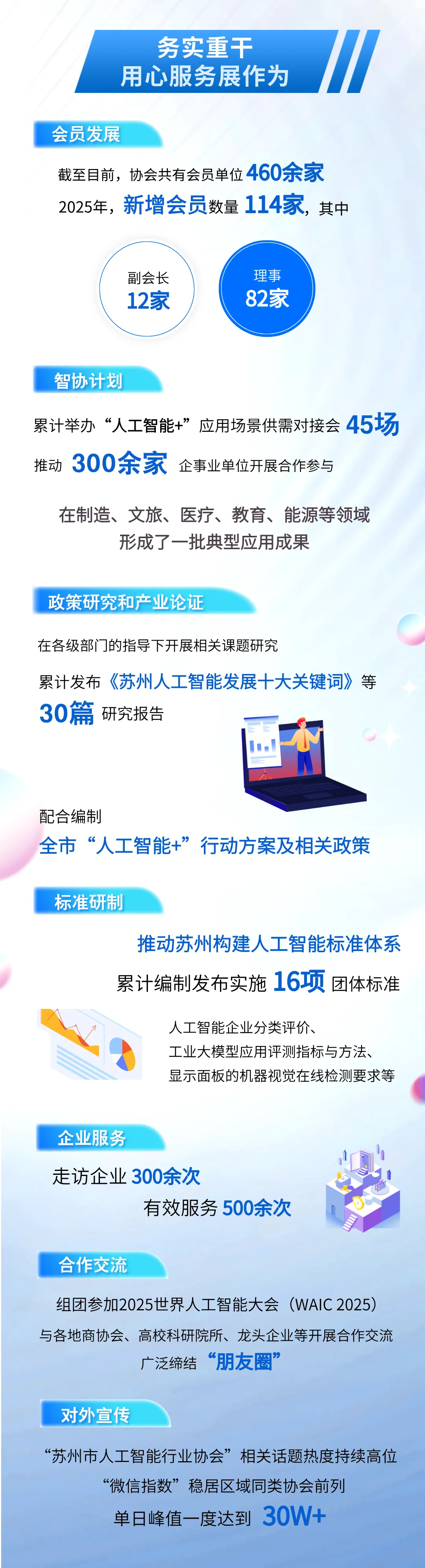 苏州市人工智能行业协会深入企业一线,全年累计走访企业300余家,通过座谈交流、实地考察等形式,重点围绕企业经营现状、技术研发、市场拓展及政策需求等维度展开走访调研,并针对企业个性化需求建立服务台账,强化相关服务精准对接。