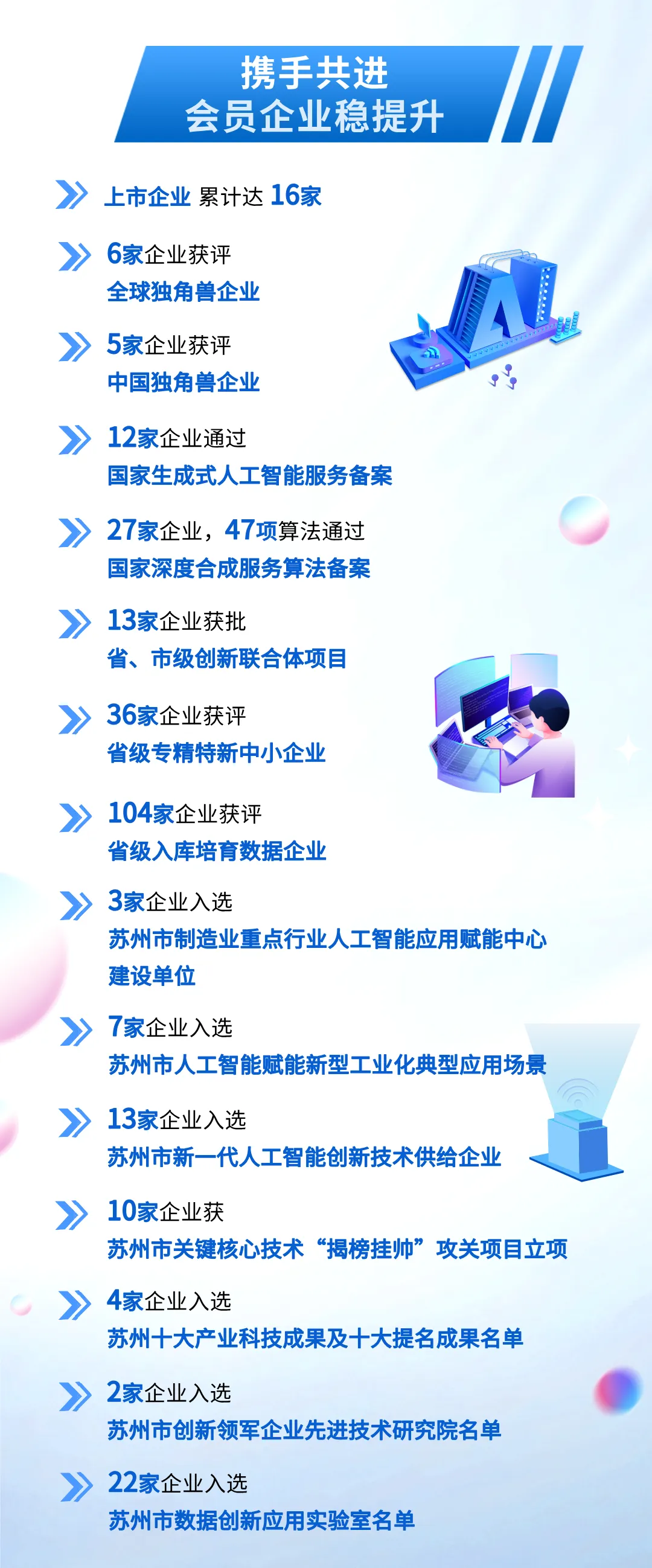 协会组织开展2025年度“AI苏州”人工智能行业荣誉表彰工作,经申报、评估审查、专家评审、名单公示等程序,共有112家企事业单位入围,并于AI苏州年度大会上集中表彰,全面激发AI创新活力,助力苏州高质量发展。
