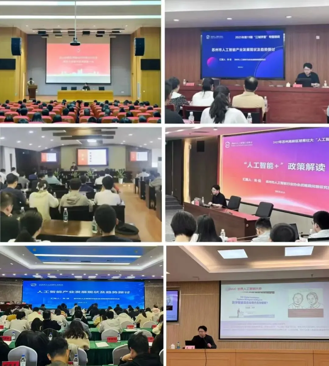 协会先后为苏州高新区、相城区、常熟市、苏州工业园区、吴江区、姑苏区等板块以及交投集团、康养集团等单位开展人工智能产业趋势与本地实践的专题交流。在全市“青年干部大课堂”中深入解析AI技术与本地产业融合路径,有效服务并提升全市在人工智能领域的专业认知与实践能力。