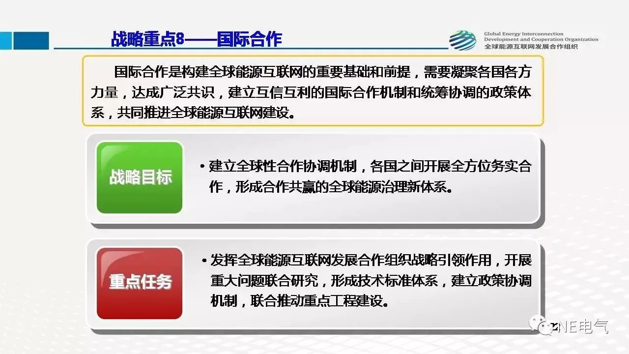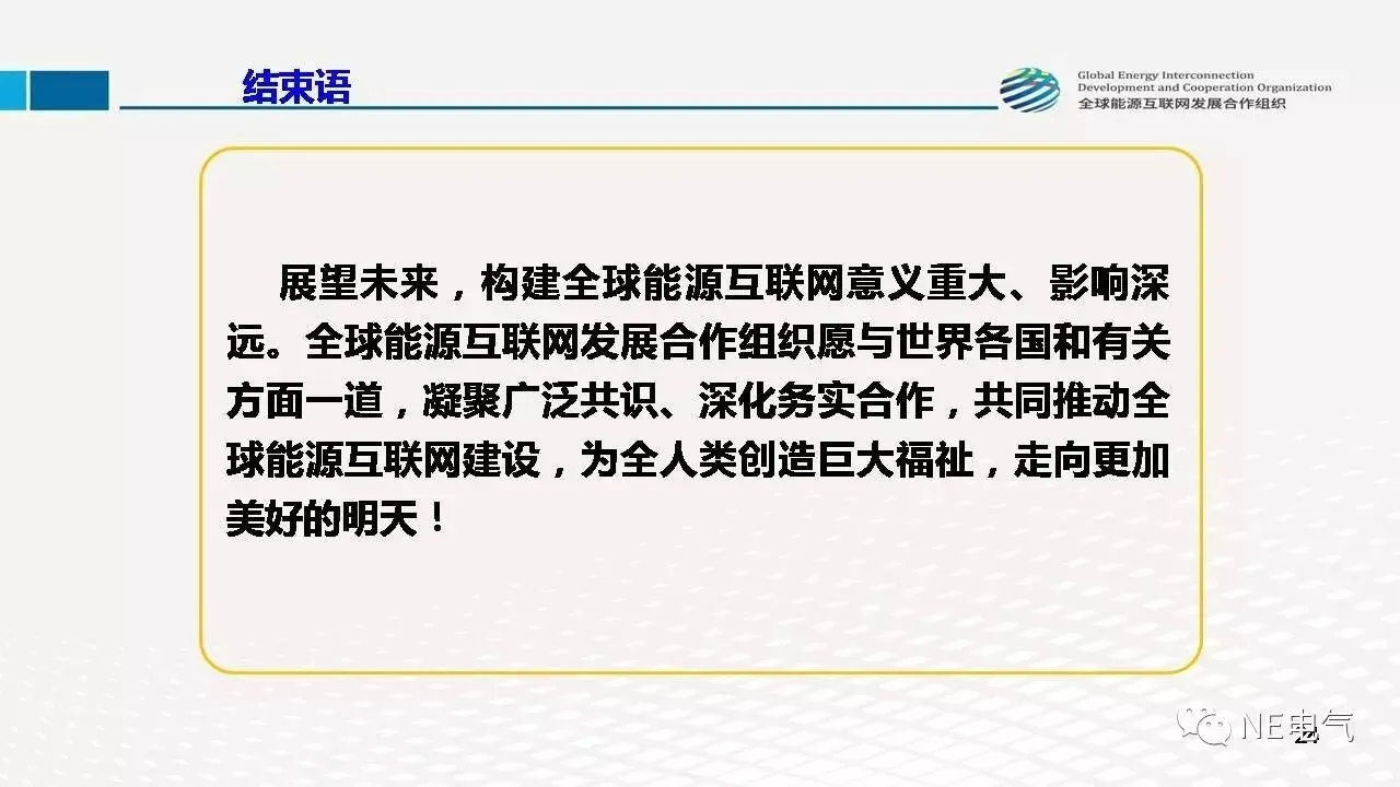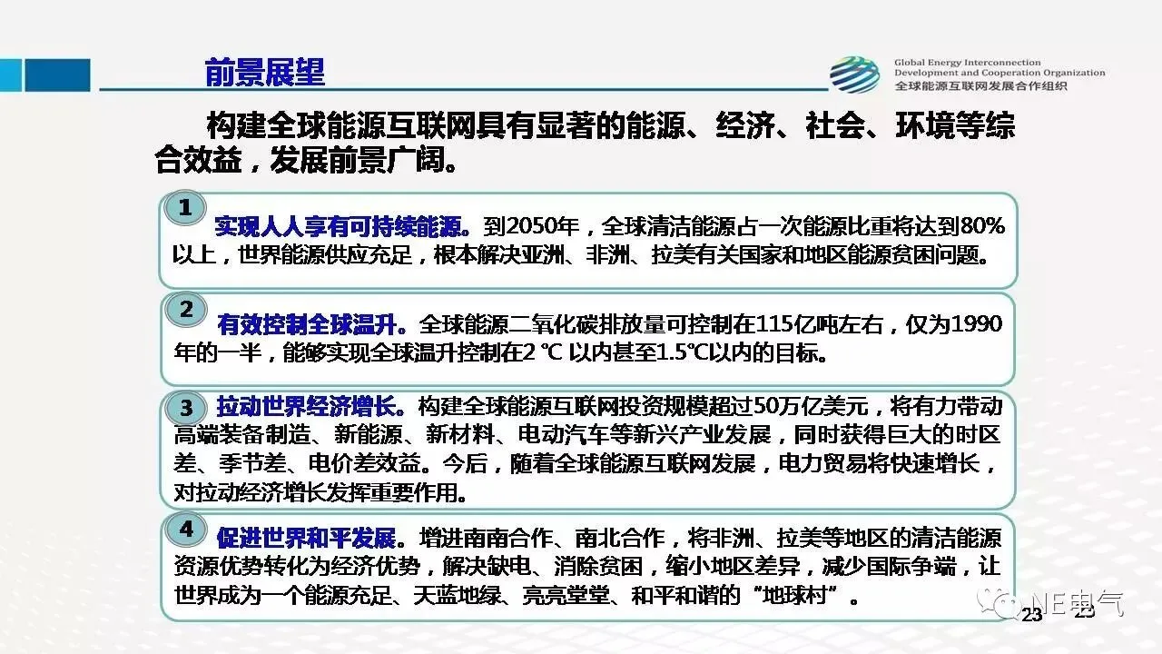 2017年2月22日,全球能源互联网发展合作组织成果发布会在北京召开,会上发布了《全球能源互联网发展战略白皮书》、《跨国跨洲电网互联技术与展望》及《全球能源互联网发展与展望(2017)》三项重要成果,勾画了未来几十年全球能源互联网的发展路径。