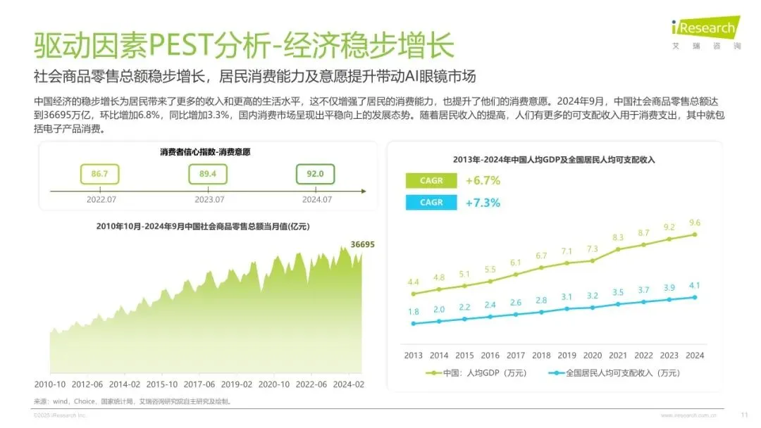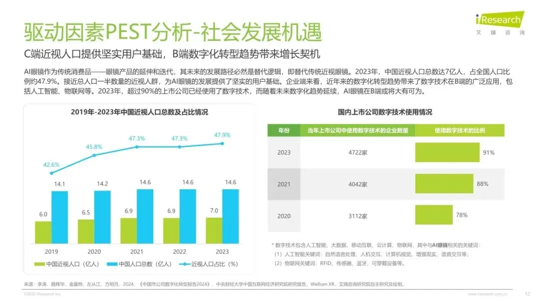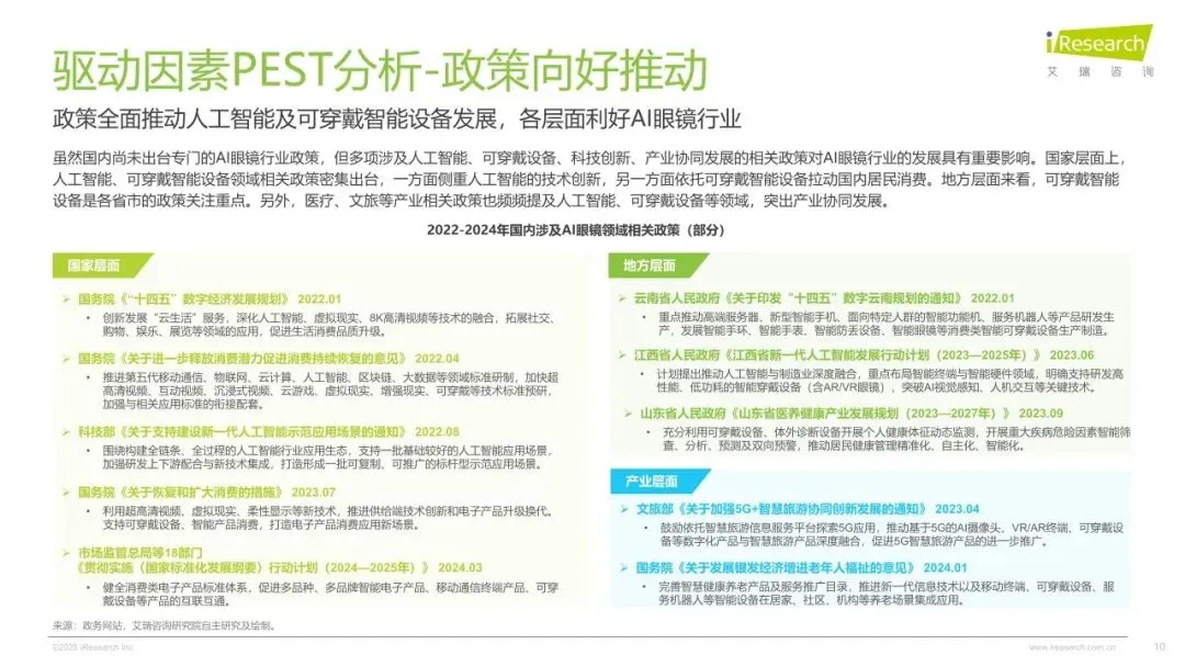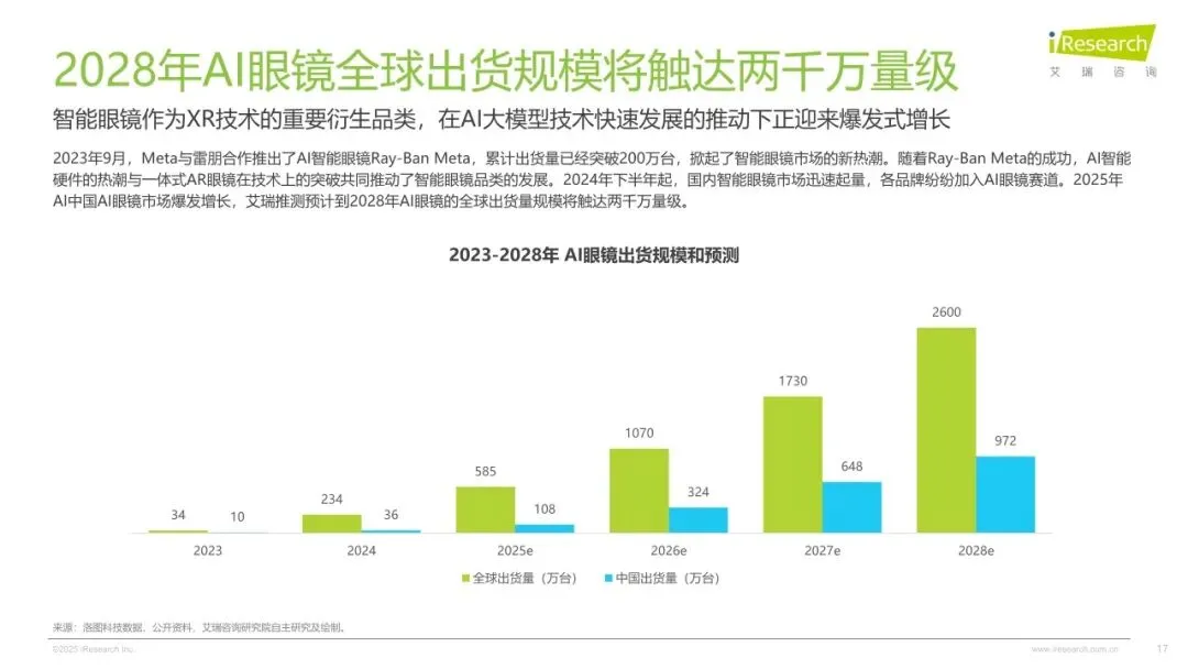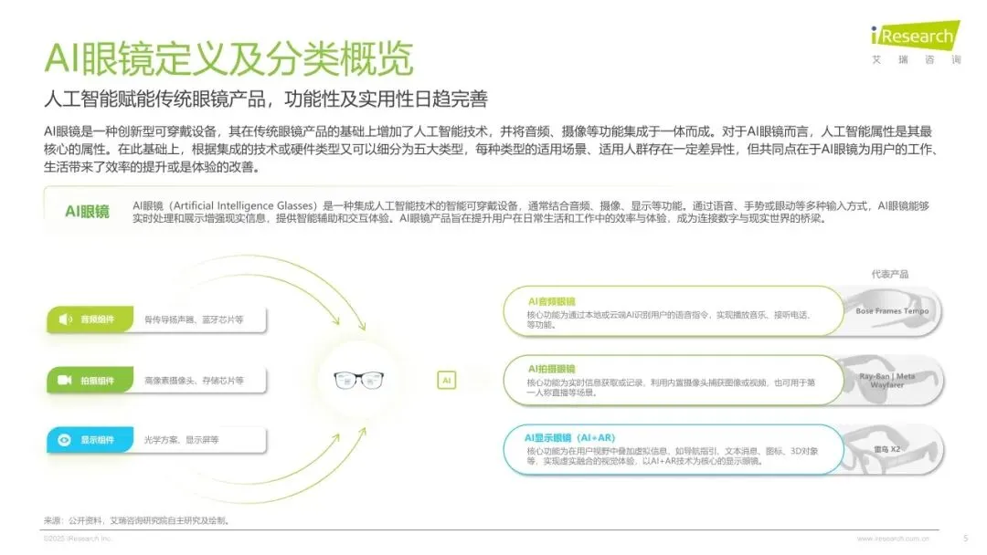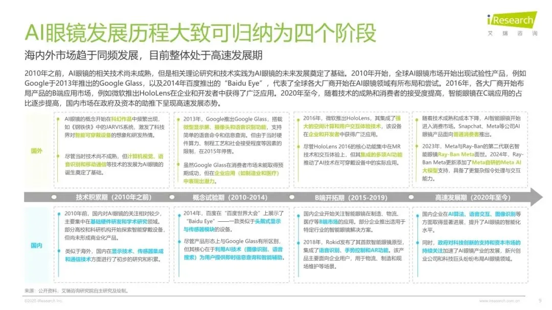 2025年,在人工智能与空间技术深度融合的产业浪潮下,中国AI眼镜行业持续突破创新边界,在医疗、工业、消费级场景呈现高质量、多极化发展态势和高速发展的状态。供给端,随着端侧大模型推理效率提升与光波导良产率突破,消费级AI眼镜成本下降,激发硬件生态繁荣。需求端,消费者对AI眼镜的需求从基础功能向多元应用场景升级,推动AI眼镜市场蓬勃发展。为了理清AI眼镜在中国市场的发展脉络、发展程度,消费者对AI眼镜的购买需求与偏好。艾瑞数智启动《2025年AI眼镜行业研究报告》项目,旨在全面剖析AI眼镜的经济价值与发展潜力,通过梳理AI眼镜的发展脉络、产业链图谱及消费者偏好,洞察AI眼镜的市场价值,剖析消费侧需求和付费动机等,为行业从业者、投资者及相关研究者提供深度的行业洞察,助力中国AI眼镜产业的健康发展。