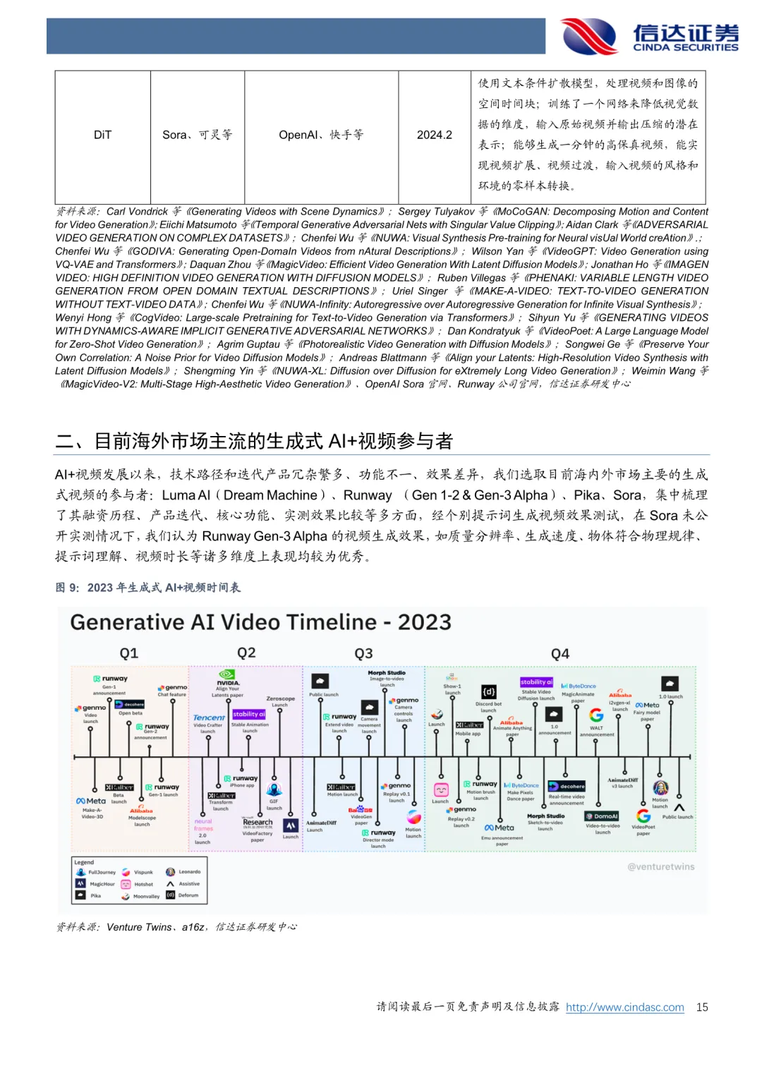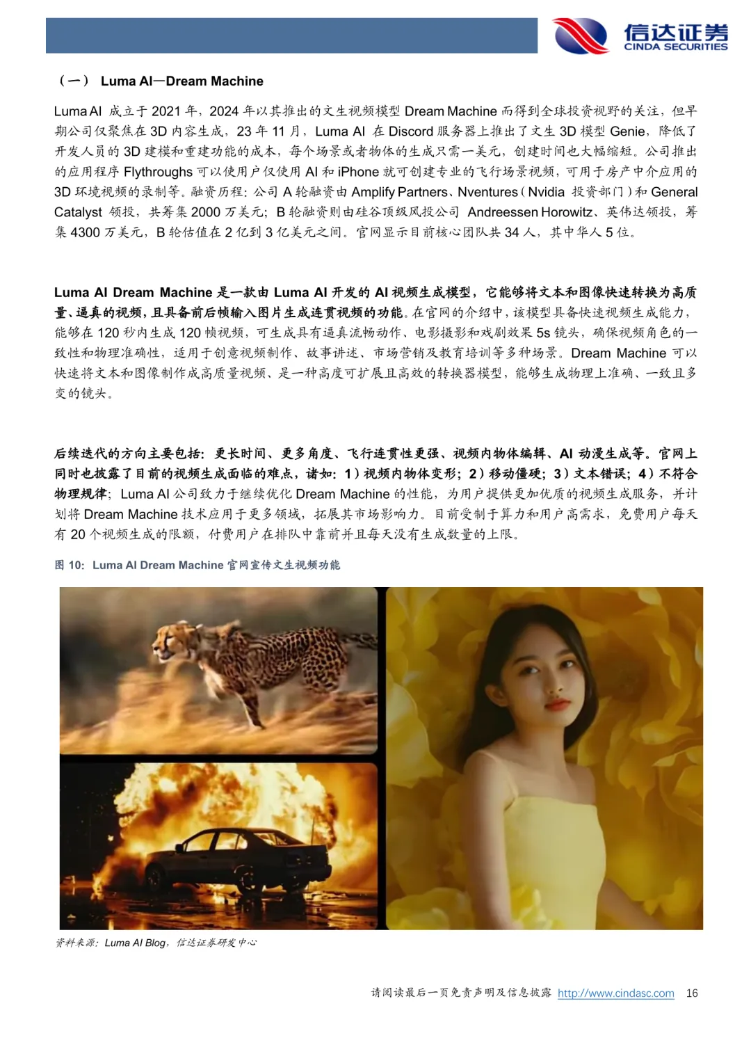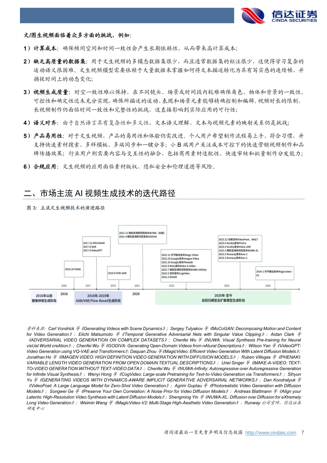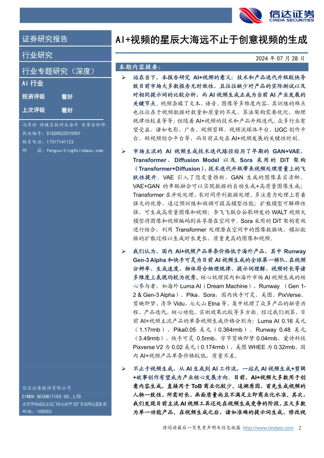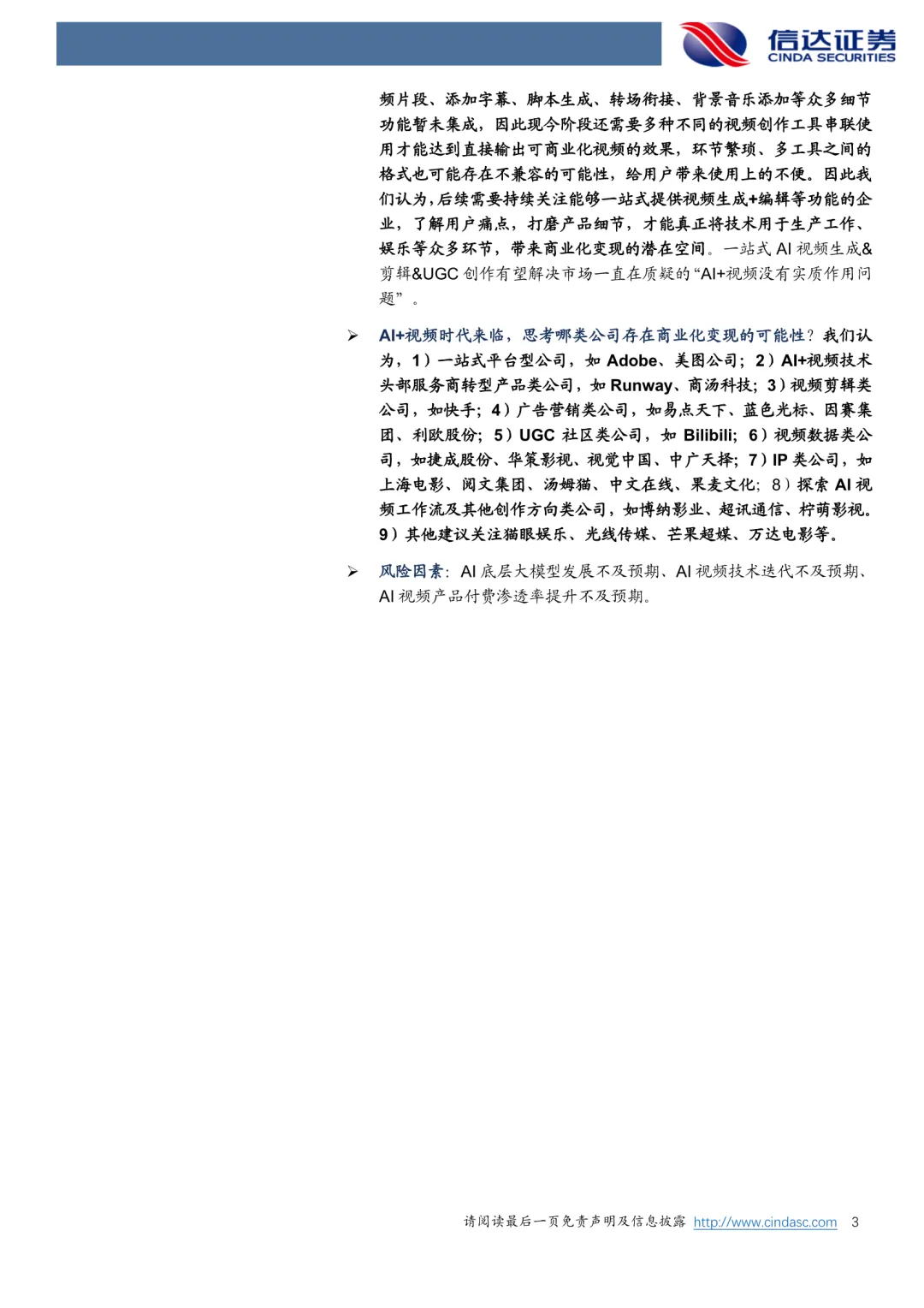站在当下,本报告研究AI+视频的意义:技术和产品迭代升级较快导致目前市场大多数报告无时效性,且往往缺少对产品的实际测试以及对相同提示词的比较分析,而AI视频生成正成为当前AI产业发展的关键节点。视频杂糅了文本、语音、图像等多维度内容,其训练的难点也往往在于视频数据对数量和质量的不足、算法架构需要优化、物理规律性较差等等,但随着AI+视频的技术和产品升级迭代,众多行业有望受益,诸如电影、广告、视频剪辑、视频流媒体平台、UGC创作平台、短视频综合平台等,而目前正处在AI+视频发展的关键性时刻。