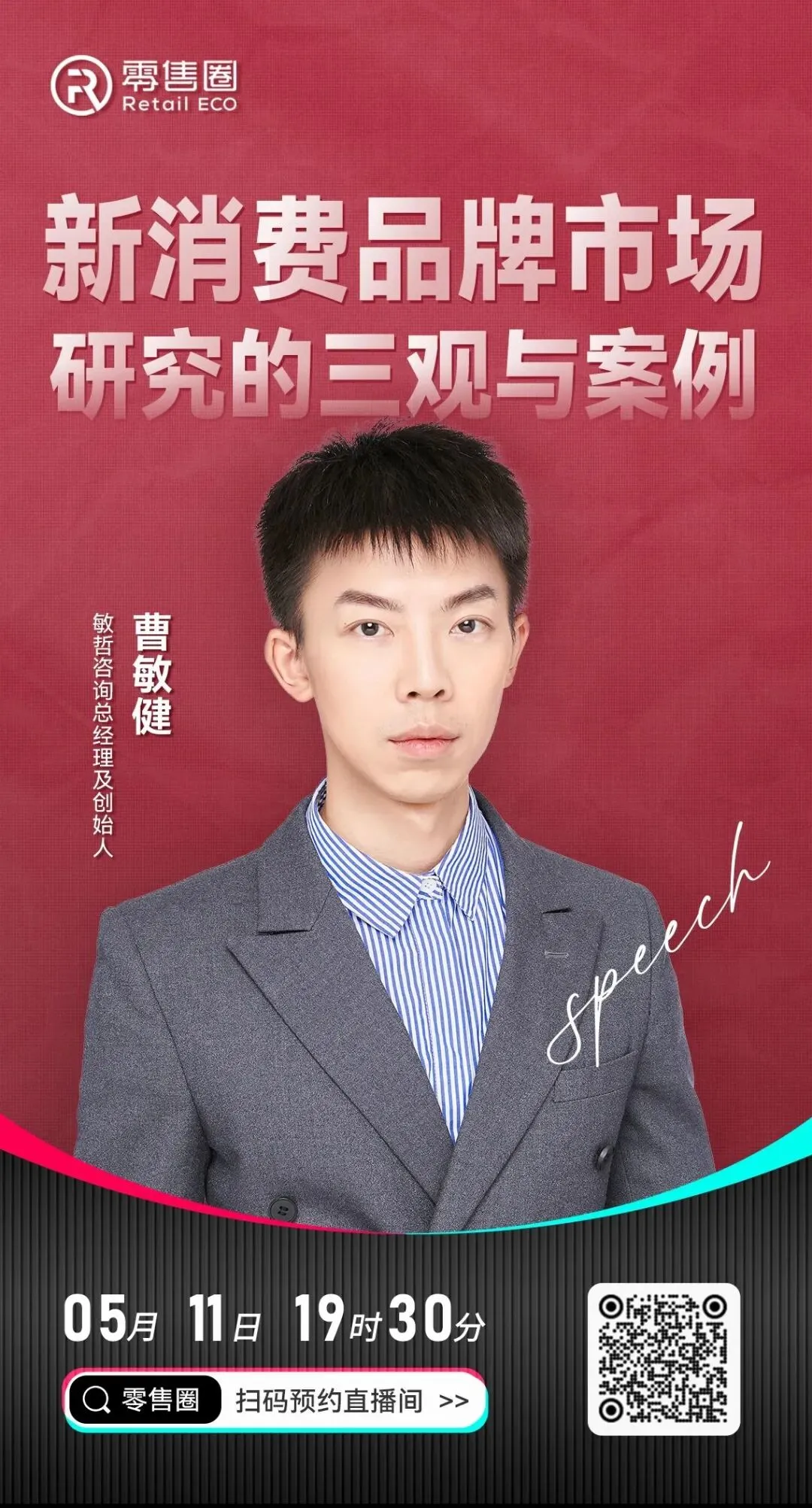 本期直播,《零售圈》将与敏哲咨询总经理及创始人曹敏健展开对话,共同探讨新消费品牌市场研究的三观与案例。