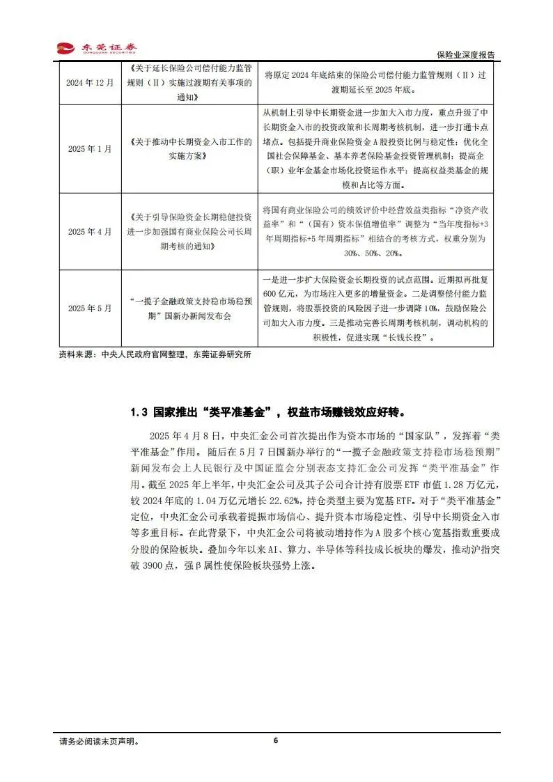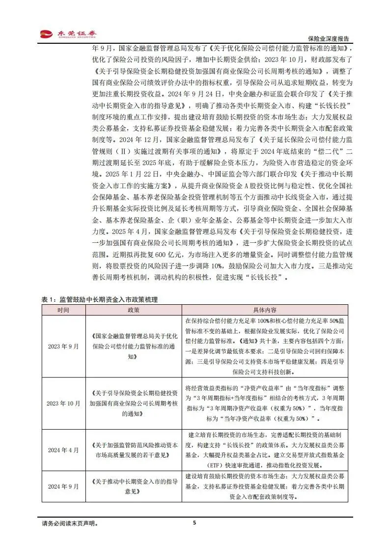 本次梳理统计了2023年以来的主要政策变化,包括优化保险公司偿付能力监管标准、推进保险资金长期投资、调整国有商业保险公司考核方式等。2025年中央金融办、证监会等多部门密集出台措施,明确提高保险资金A股投资比例,批复600亿元增量资金,调低股票投资风险因子,持续鼓励保险公司加大权益市场配置,为保险板块估值修复奠定基础。
