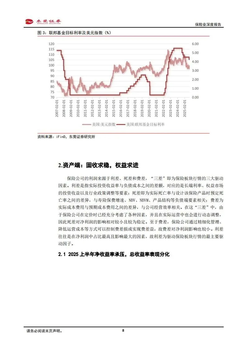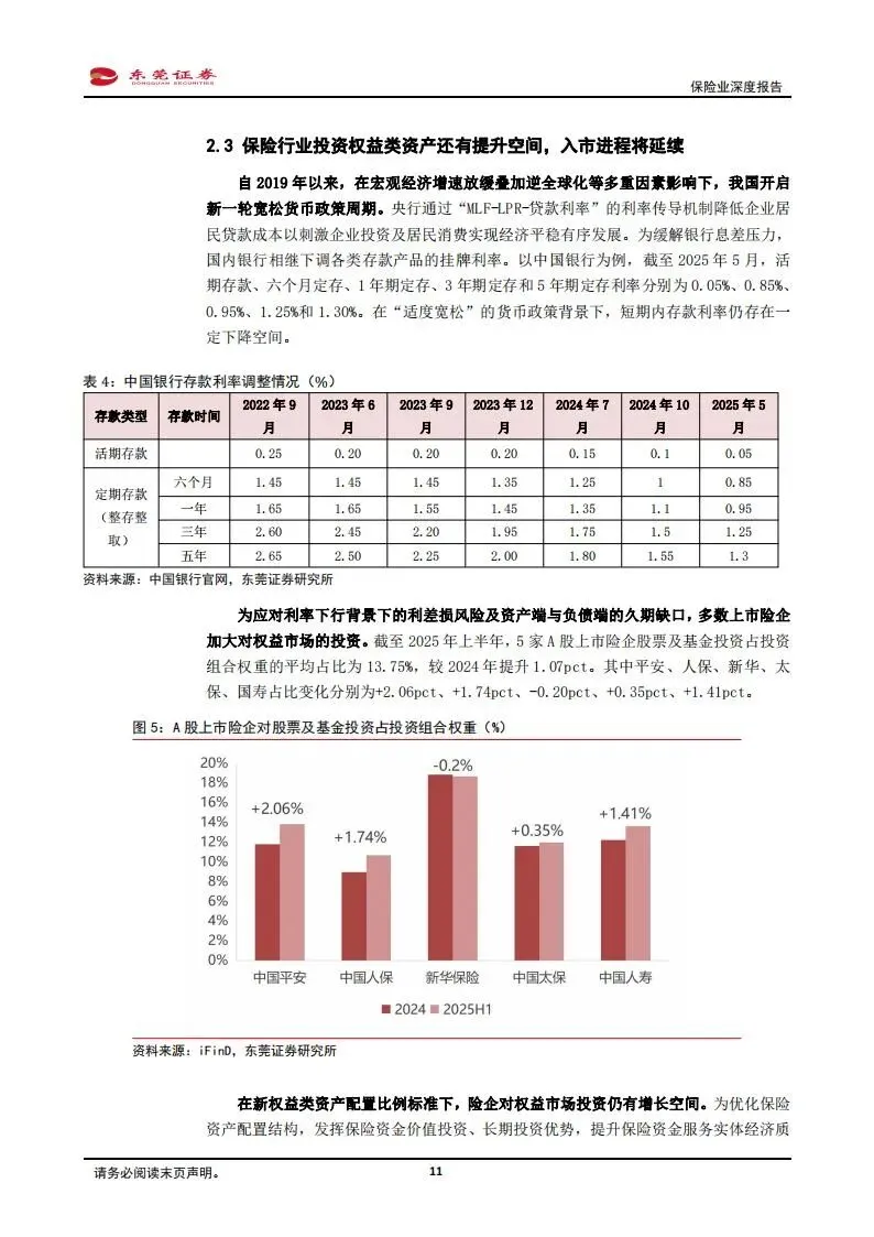 利率下行促使各险企主流储蓄险产品从增额终身寿险切换为分红险。2025年上半年,中国太保新保期缴中分红险占比42.5%,新华保险分红险新单保费占比11.68%。中国平安、新华保险分红险总保费占比分别为12.79%、15.07%。分红险在低利率环境下吸引力增强,产品结构切换有助于降低负债成本和利差损风险。