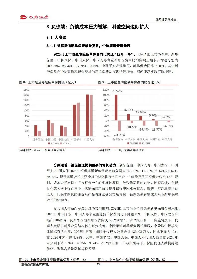 NBVM(新业务价值率)持续提升,2025年上半年中国平安、太保NBVM分别为30.5%、15.0%。人保寿险NBV增速71.7%,新华保险58.4%,中国平安39.8%,中国太保32.3%,中国人寿20.3%。银保渠道强势补位,代理人产能提升成为NBVM增长关键。