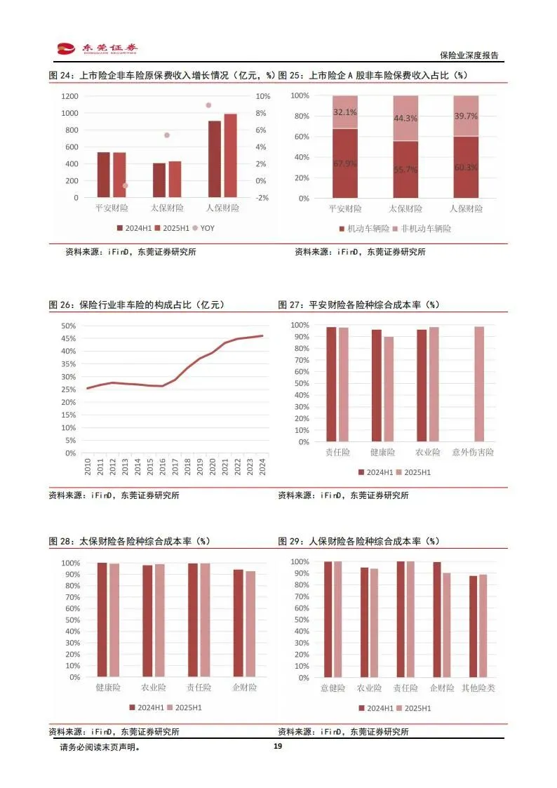 上半年,平安财险原保险保费收入1719亿元,同比增长7.10%;人保财险3233亿元,3.60%;太保财险1128亿元,0.90%。非车险市场分化,平安财险非车险原保费收入同比增长13.82%,收入占比提升至37%。车险原保费收入延续增长,综合成本率全面优化。非车险市场中,责任险、健康险、农业险综合成本率各有差异,部分险种费用率高于100%,整体非车险业务仍需优化。