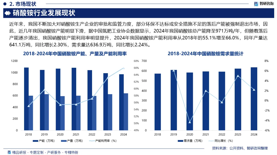 硝酸铵(NH₄NO₃),是一种铵盐,化学式为 NH₄NO₃,呈白色结晶性粉末,极易溶于水,易吸湿结块,溶解时吸收大量热,受猛烈撞击或受热爆炸性分解,遇碱分解,根据生产工艺的不同,硝酸铵可制备成粉状、粒状和多孔粒状等形状,也可以硝酸铵溶液形式存在。近年来,我国不断加大对硝酸铵生产企业的审批和监管力度,部分环保不达标或安全措施不足的落后产能被强制退出市场,因此,近几年我国硝酸铵产能明显下滑,据中国氮肥工业协会数据显示,2024年我国硝酸铵总产能降至971万吨/年,但随着落后产能逐步清出,我国硝酸铵产能利用率明显提升,2024年我国硝酸铵产能利用率从2018年的55.1%增至66.0%,同年产量达641.1万吨,同比增长2.30%,需求量达636.9万吨,同比增长2.24%。