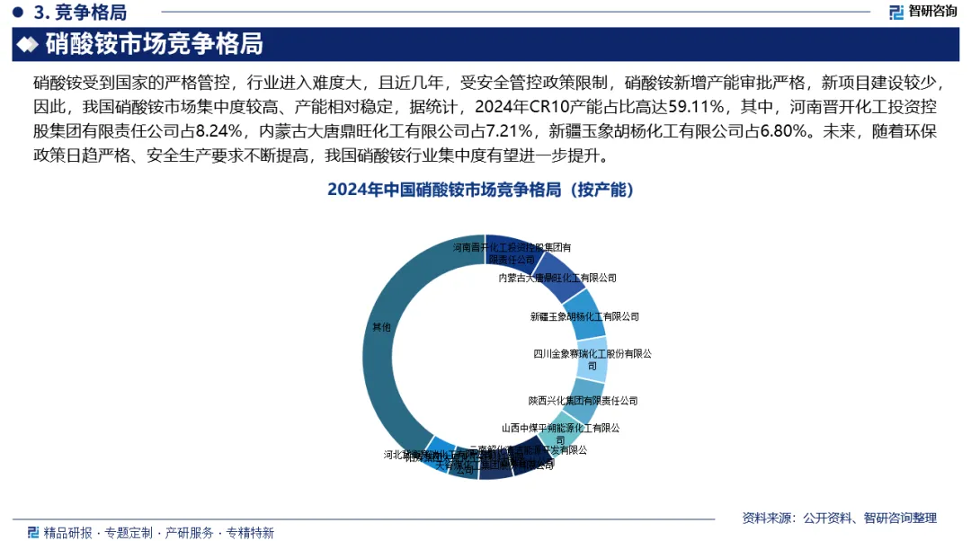 市场竞争格局:硝酸铵受到国家的严格管控,行业进入难度大,且近几年,受安全管控政策限制,硝酸铵新增产能审批严格,新项目建设较少,因此,我国硝酸铵市场集中度较高、产能相对稳定,据统计,2024年CR10产能占比高达59.11%,其中,河南晋开化工投资控股集团有限责任公司占8.24%,内蒙古大唐鼎旺化工有限公司占7.21%,新疆玉象胡杨化工有限公司占6.80%。