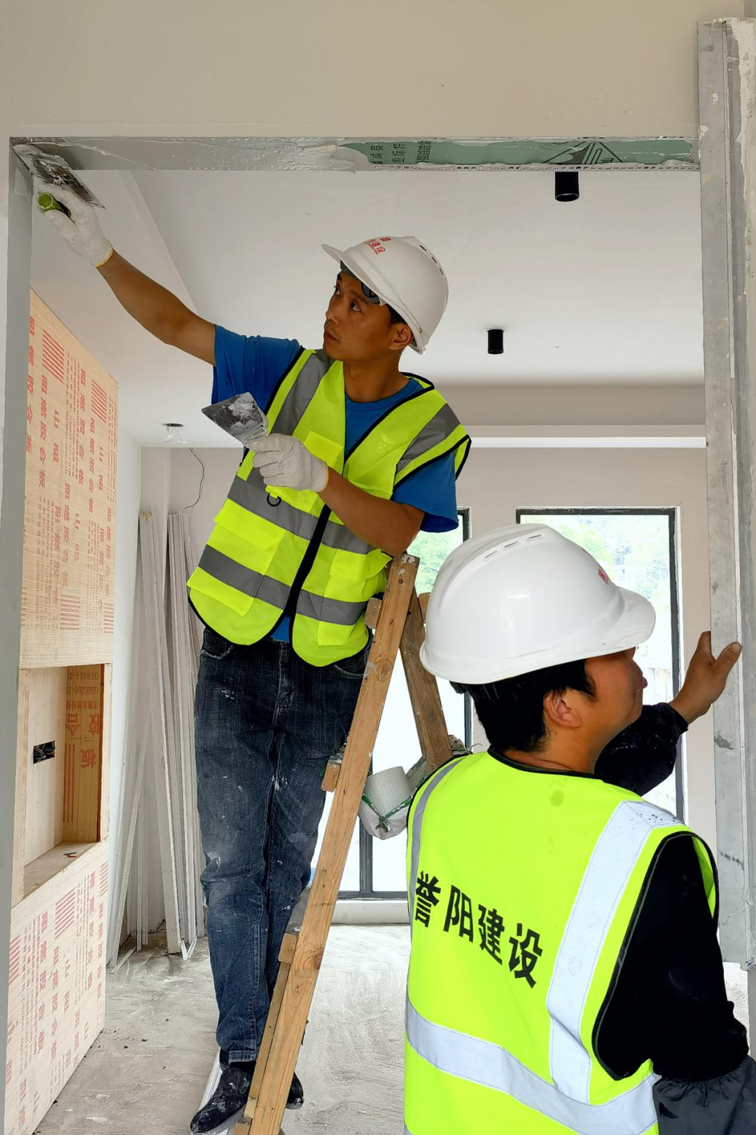 在庐江县冶父山许山里项目施工现场,顶面做漆基层找补、墙面批灰在酷暑中推进,时间紧任务重,作业现场工人们正全力施工。虽然是在室内工作,但是空间相对封闭,就是站上一会儿,都会大汗淋漓,但工人们仍旧恪尽职守、挥汗如雨地坚守在工地的第一线,认认真真地、全身心地投入到施工当中,保质保量地完成任务,保证施工项目按照既定进度推进。