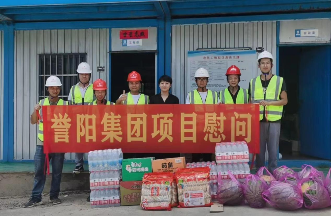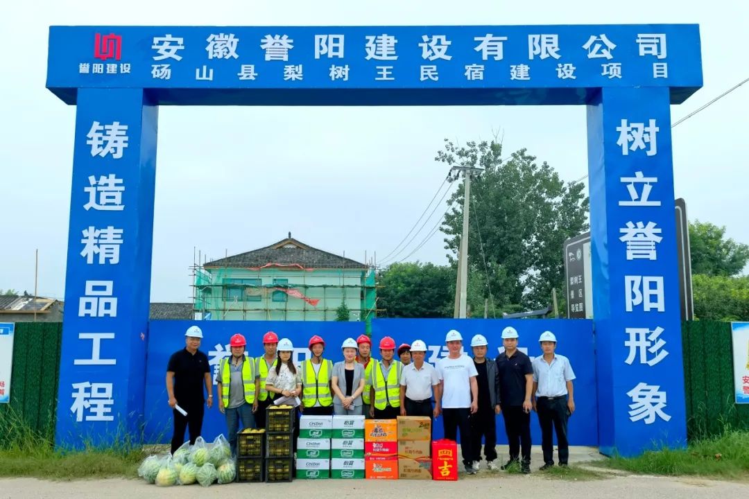 7月27日,安徽誉阳控股集团董事长沈欣一行到砀山县梨树王民宿建设项目现场进行高温调研慰问活动,为奋战在一线的作业人员送去防暑降温物品,传递集团公司对他们的关心关爱。