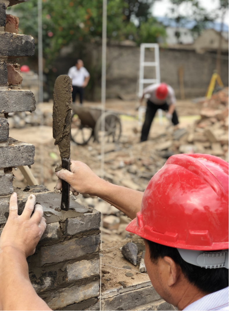 在凤阳县小岗村小韩庄特色民宿项目现场,工人正在用传统工艺三点一线校正垂直线、手工制作造型老青砖,用汗水铸就“乡村之美”。