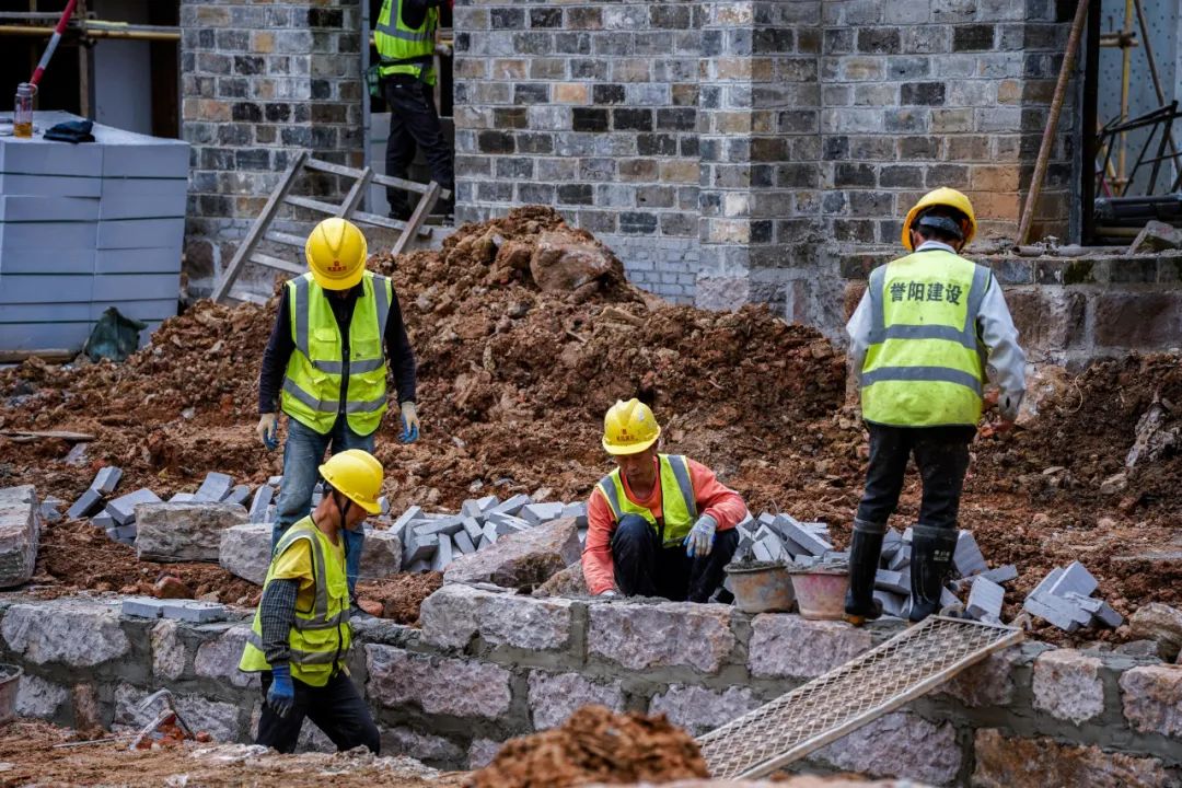 在滁州市琅琊山南门民宿项目施工现场,为了保证节点目标如期完成,施工工人面对酷暑,在高温下人工抬老石板,整个施工现场紧张、忙碌而有序,大家都在各自坚守的岗位上奋力鏖战。