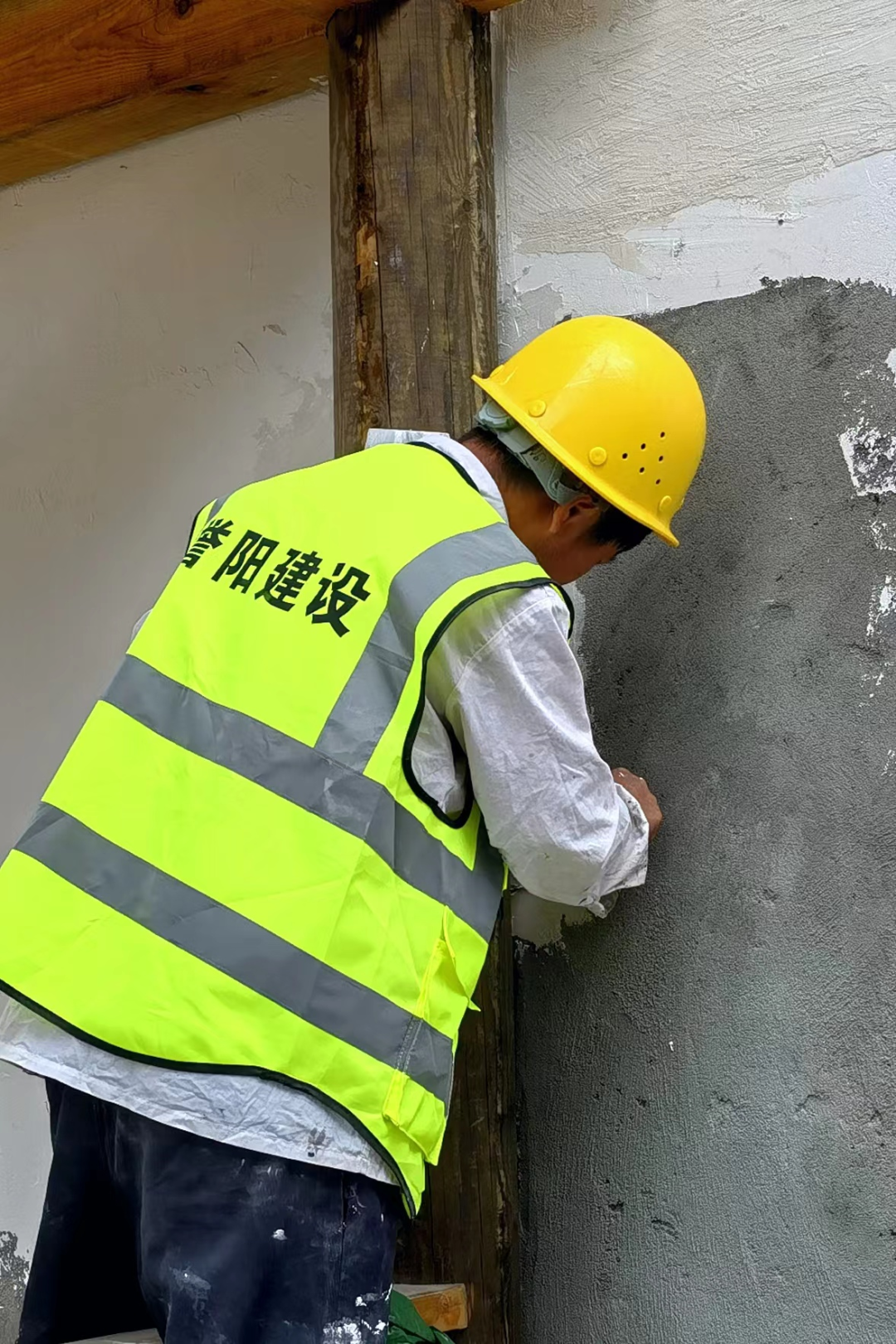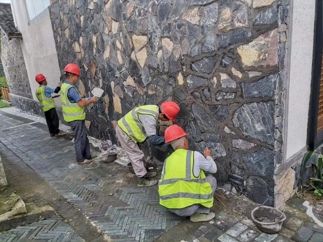 在肥东县山口凌乡村振兴项目施工现场,在做好高温天气防范应对的前提下工人们正在加班加点墙面石板嵌缝,忙建设,赶生产。