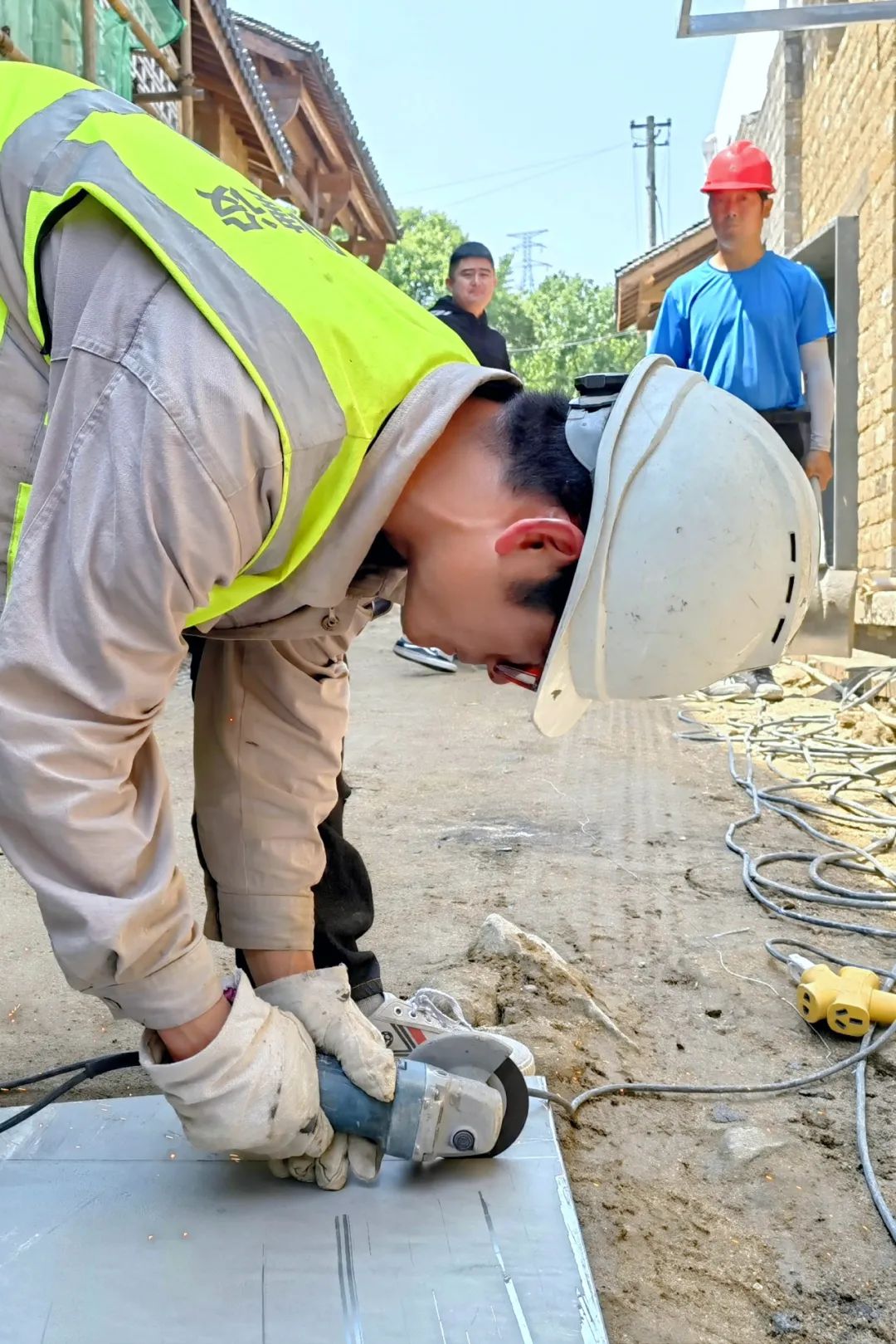 在砀山县梨树王民宿建设项目建设施工现场,阳光炙烤、热浪扑面,工人们有的在绑扎钢筋,有的在现场传递材料和转运材料,面对高温“烤”验,始终坚守一线推进建设进度。