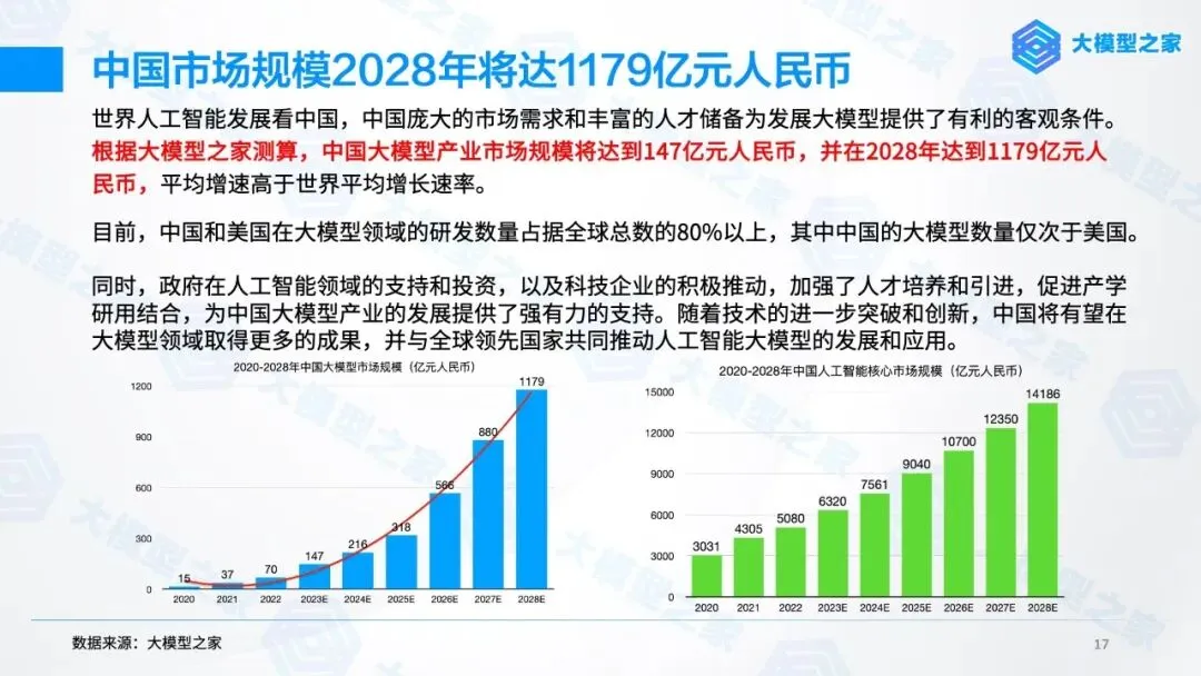 据大模型之家测算,预计到2023年,全球人工智能大模型市场规模将达到210亿美元,并且预计随着大模型的进一步发展和技术的不断创新,为企业和组织提将供了更强大的数据分析、预测能力和智能化解决方案,为人工智能领域带来更多商机和发展空间,持续为市场贡献增长动力。这一趋势将推动人工智能领域的快速增长,并在2028年使大模型市场规模达到1095亿美元。