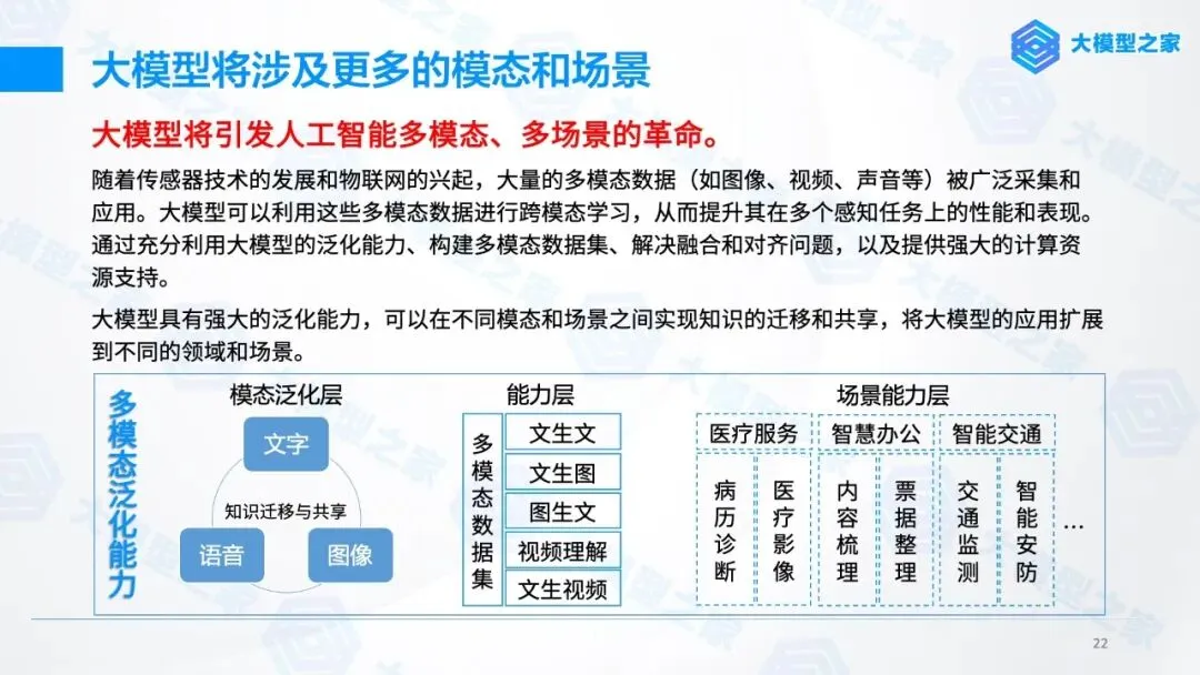 在人工智能多模态、多场景方面,大模型将涉及更多的模态和场景,且具有强大的泛化能力,可以在不同模态和场景之间实现知识的迁移和共享,将大模型的应用扩展到不同的领域和场景。