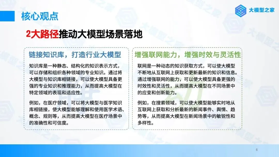 《报告》还结合当下大模型产业发展格局指出现阶段大模型落地的两大路径。针对不同行业的场景特点,进行有针对性的知识增强在解决现阶段问题中发挥着重要作用。通过链接知识库进行专业知识增强,打造行业大模型,或是通过增强联网的能力实时扩充大模型知识储备,大模型能够深入了解各个行业的专业知识,并将其融合到模型的学习和推理中。