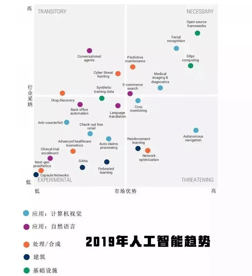 编者按:知名创投研究机构CB Insights调研了25种最大的AI趋势,以预测2019年该技术的下一步趋势,他们根据行业采用率和市场优势评估了每种趋势,并将其归类为必要性、实验性、威胁性、暂时性四类。