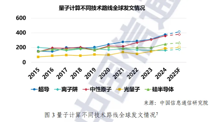 现阶段不同量子计算技术路线并行发展,超导、离子阱、中性原子、光量子、硅半导体等路线的科研论文数量统计如图3所示,展现了各技术路线的研究热度分布。可以看出,上述技术路线均受到学术界的重点关注,发文量持续保持高位,尤其是超导量子计算和中性原子量子计算,近年来论文发表数量高于其他技术路线。
