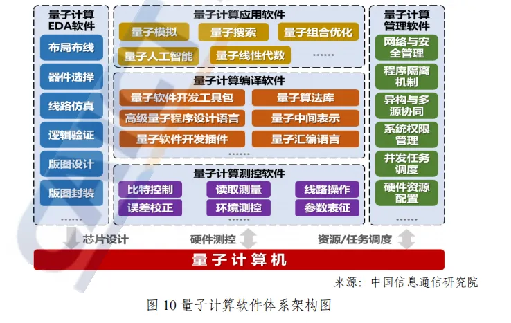 量子计算软件是连接量子计算硬件与实际应用的关键桥梁。尽管量子计算机研发仍处于早期阶段,尚未完全成熟,但业界已在多个软件领域积极布局,包括量子计算应用软件、编译软件、测控软件、EDA软件和管理软件等,并在工具研发与生态建设方面取得了阶段性进展。量子计算软件体系架构如图10所示,各类功能不同的软件工具协同作用,共同推动量子软件技术的整体发展。
