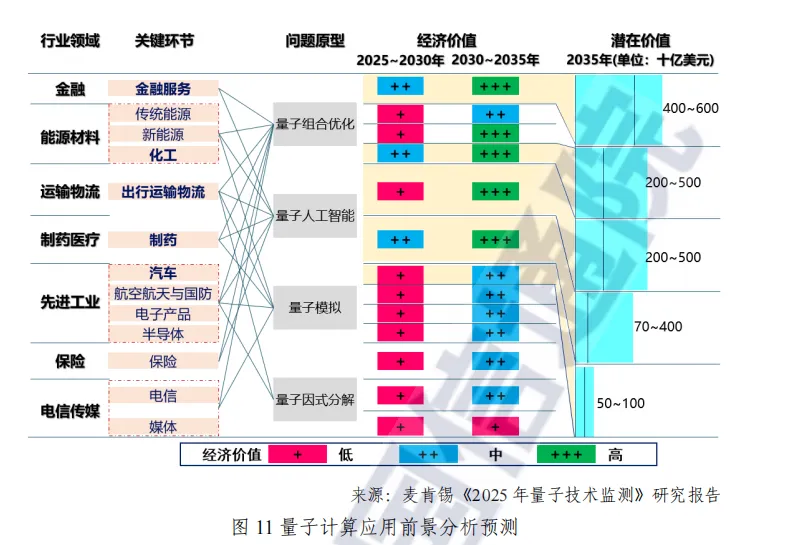 量子计算正处于从理论研究向应用落地探索转化的关键阶段。在此过程中,跨行业、多场景的应用探索已成为推动应用落地突破的核心驱动力。业界持续挖掘与量子计算技术匹配的垂直应用场景,寻找面向金融、化工、生物、交通等不同行业领域的解决方案。根据麦肯锡2025年发布的《量子技术监测》研究报告,如图11所示,预计到2035年全球量子技术市场规模将达到970亿美元,其中量子计算最具潜力并将占据最大份额,收入规模预计将从2024年的40亿美元增长至2035年的720亿美元。