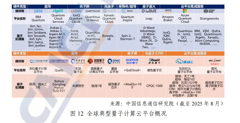 目前,全球量子计算云平台汇聚了超导、离子阱、中性原子、光量子、硅半导体等多种技术路线的通用量子计算处理器,以及量子退火机等专用量子计算处理器。从技术路线分布来看,以超导技术路线为主,占比约59.3%;其次为离子阱和光量子技术路线,占比分别为14.8%和9.3%。由此表明,超导技术路线相比其他技术路径具备更高的工程化水平。从时间发展脉络来看,加拿大企业D-Wave率先为量子退火机提供云平台服务。随着其他技术路线的不断发展,2022年前后,大批不同技术路线的通用量子计算处理器陆续开始提供云服务。截至2025年8月底,全球量子计算云平台接入的量子处理器数量已超过50台,典型量子计算云平台如图12所示。