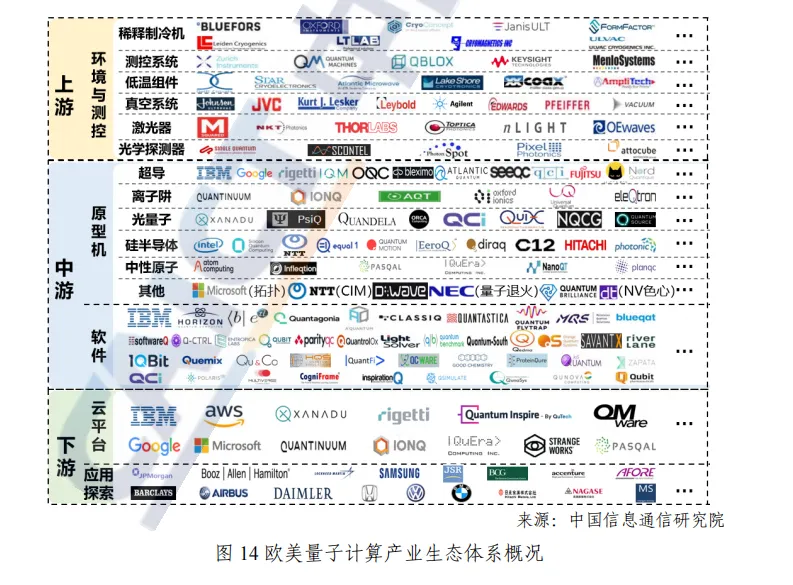 量子计算产业生态呈现蓬勃发展的态势,从硬件研发到应用探索的全链条创新能力持续增强。上游企业在环境测控系统方面不断实现技术突破,中游企业在量子计算原型机研制与软件算法开发方面稳步推进,下游企业则积极拓展应用场景并加快建设量子计算云平台,共同形成了产业生态雏形。与此同时,各类创新主体持续涌入量子计算领域,产业生态体系如图14所示,包括科技企业、初创企业等在内的多元参与者共同推动产业化进程。