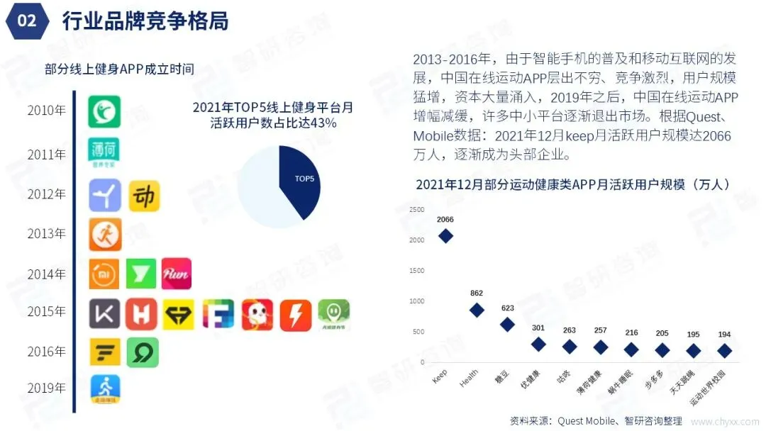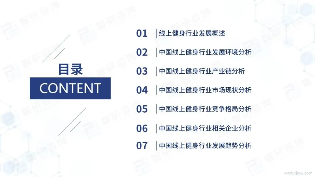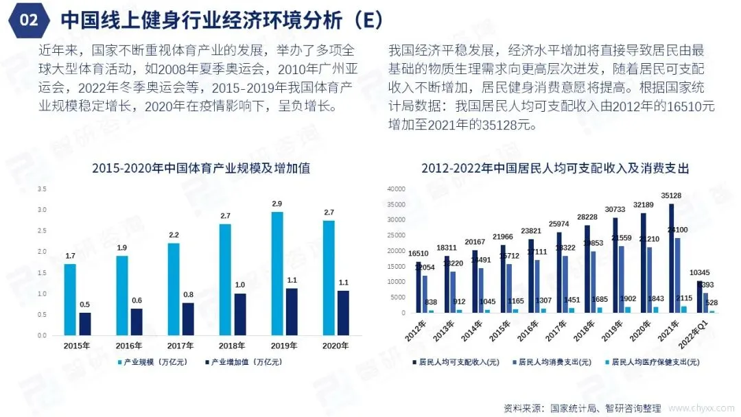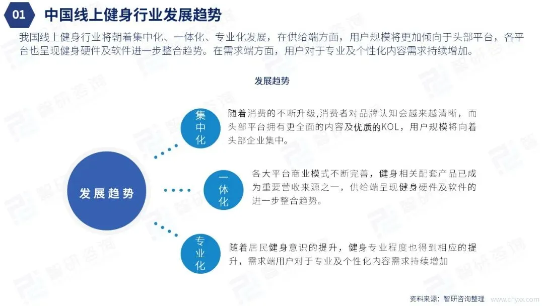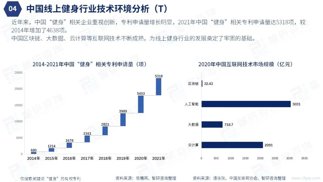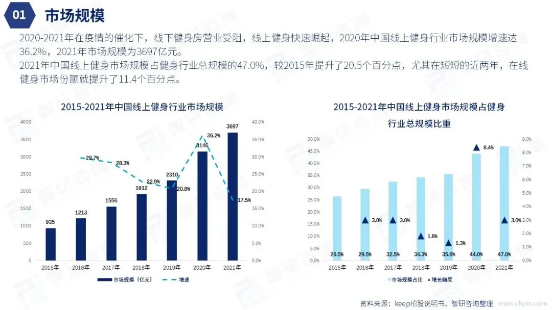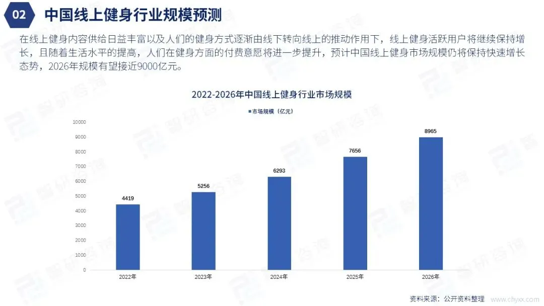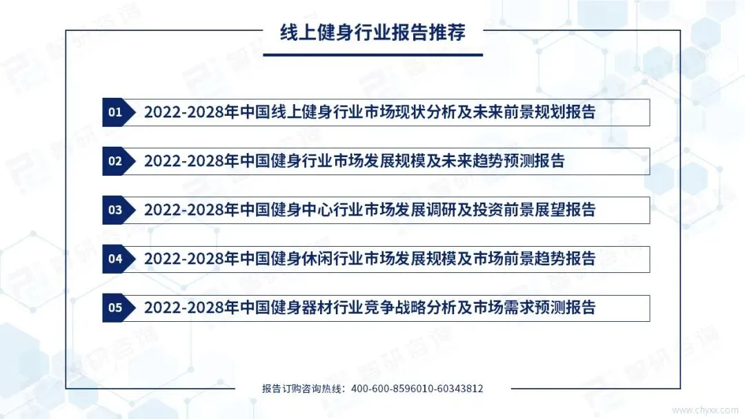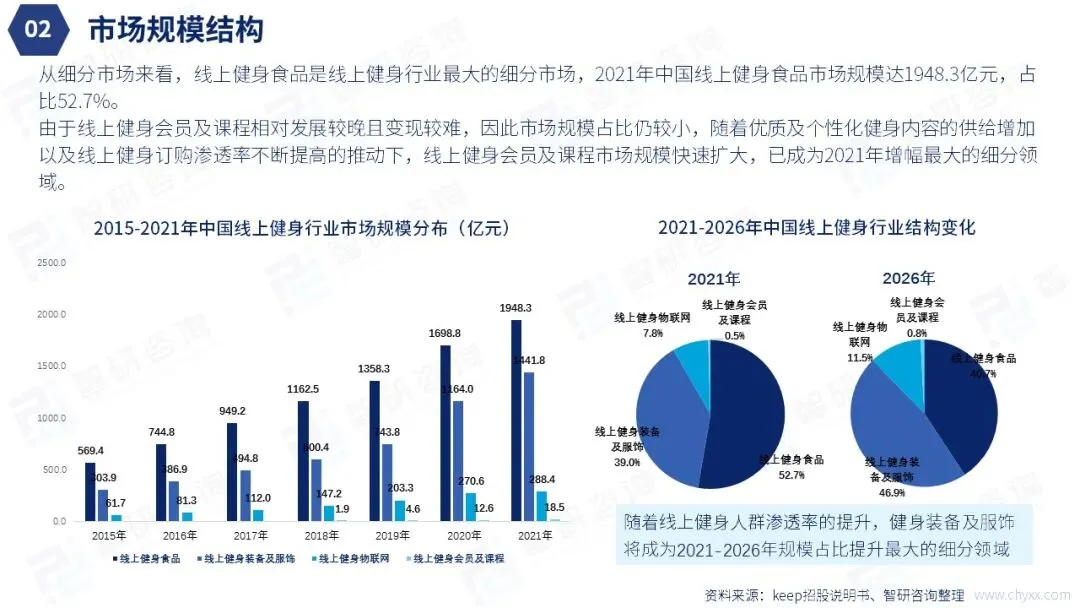 随着社会的发展和人们健康意识的提高,健身已成为一种流行的减压和维持身体健康的方式。在政策、经济、社会及技术因素的推动下,我国线上健身行业发展迅速,带动产业链上下游相关产品规模不断扩大。2020-2021年在疫情的催化下,线下健身房营业受阻,线上健身快速崛起,2021年中国线上健身月活跃用户数达1.4亿人,市场规模达3697亿元,其中线上健身食品是最大的细分市场,线上健身会员及课程是2021年增幅最大的细分领域。市场一片蓝海使得众多企业纷纷入局,尤其在2019年前,大量平台涌现,竞争十分激烈,2019年后,许多中小平台逐渐退出市场,行业龙头初显。随着消费者需求的多元化,未来我国线上健身行业将朝着集中化、一体化、专业化发展,规模也将持续扩大,2026年规模有望接近9000亿元。