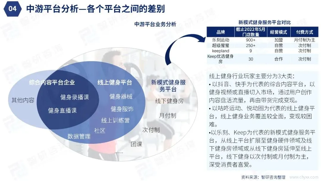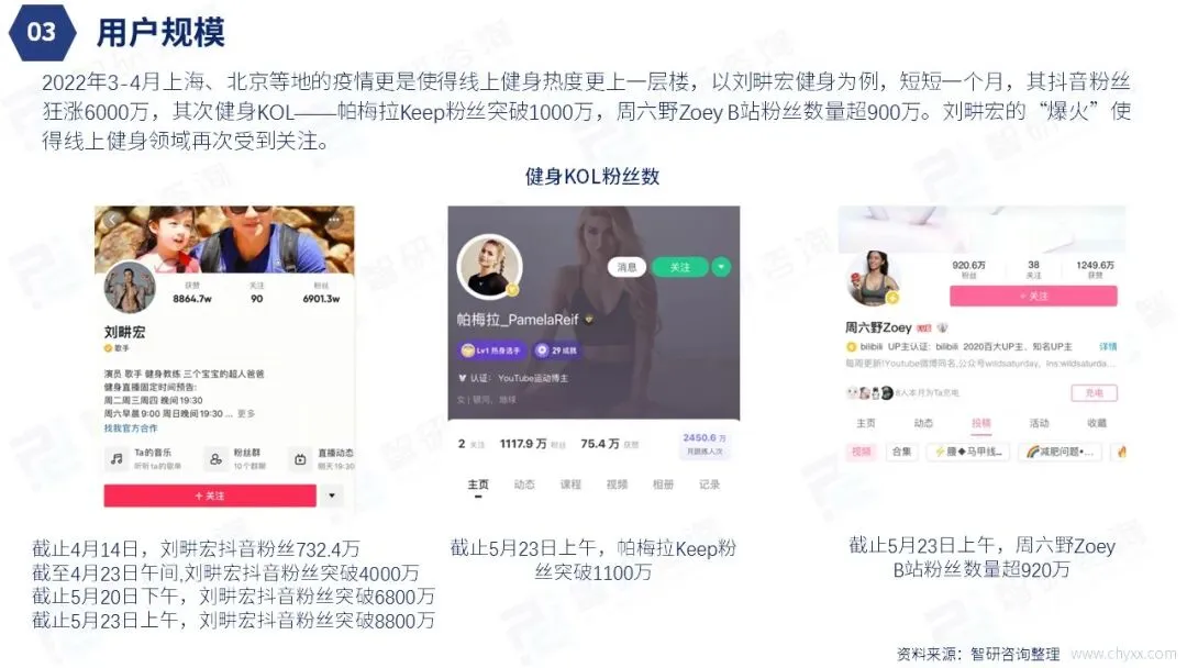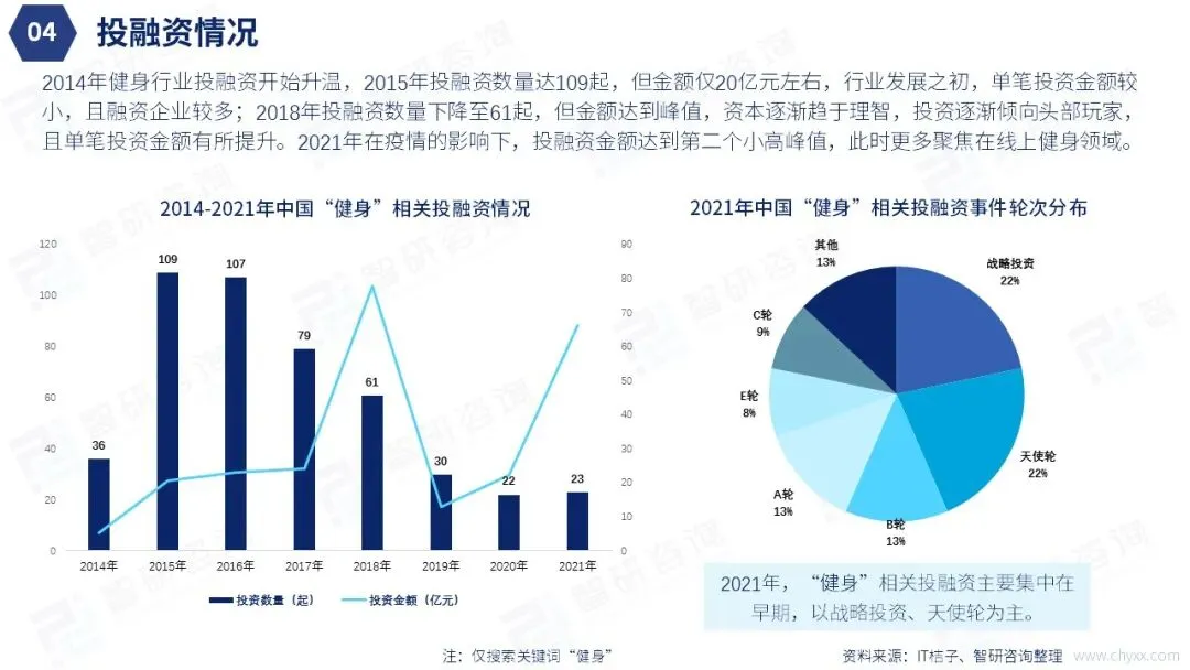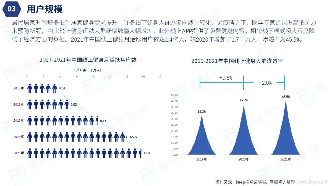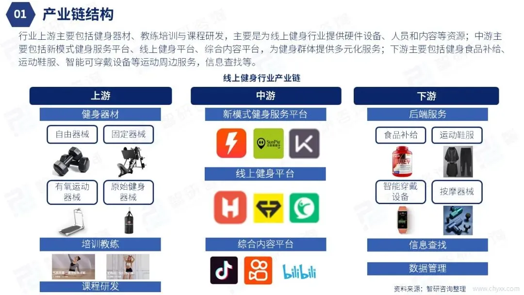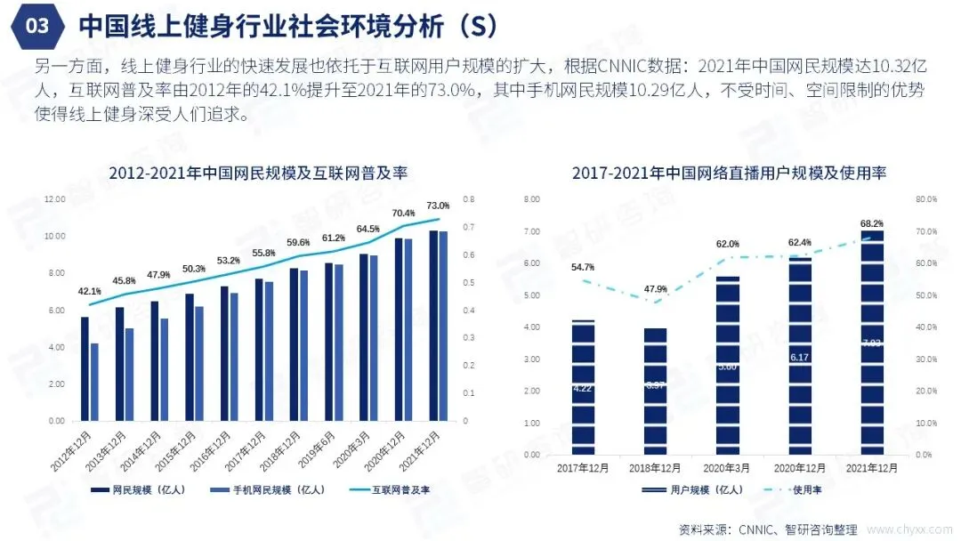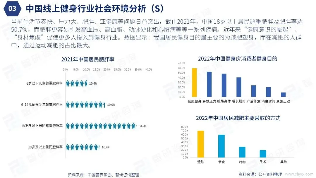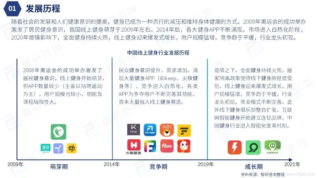 随着社会的发展和人们健康意识的提高,健身已成为一种流行的减压和维持身体健康的方式。在政策、经济、社会及技术因素的推动下,我国线上健身行业发展迅速,带动产业链上下游相关产品规模不断扩大。2020-2021年在疫情的催化下,线下健身房营业受阻,线上健身快速崛起,2021年中国线上健身月活跃用户数达1.4亿人,市场规模达3697亿元,其中线上健身食品是最大的细分市场,线上健身会员及课程是2021年增幅最大的细分领域。市场一片蓝海使得众多企业纷纷入局,尤其在2019年前,大量平台涌现,竞争十分激烈,2019年后,许多中小平台逐渐退出市场,行业龙头初显。随着消费者需求的多元化,未来我国线上健身行业将朝着集中化、一体化、专业化发展,规模也将持续扩大,2026年规模有望接近9000亿元。