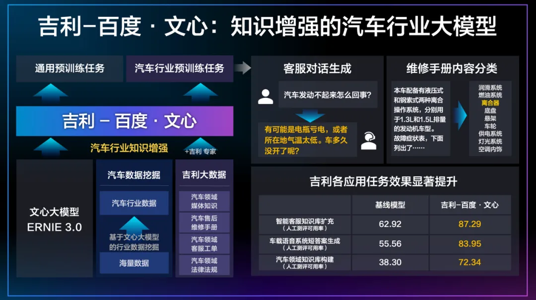吉利与百度共建的吉利-百度·文心汽车行业大模型使用了百度文心ERNIE 3.0大模型,在智能客服知识库扩充、车载语音系统短答案生成、汽车领域知识库构建三个任务上进行了微调与验证。该大模型在2300万条吉利汽车专业领域无标注数据上进行模型预训练,并联合双方的人工智能专家和汽车行业专家一起研发,充分理解掌握了汽车行业知识,从而得到性能更强、稳定性更高的汽车行业大模型。